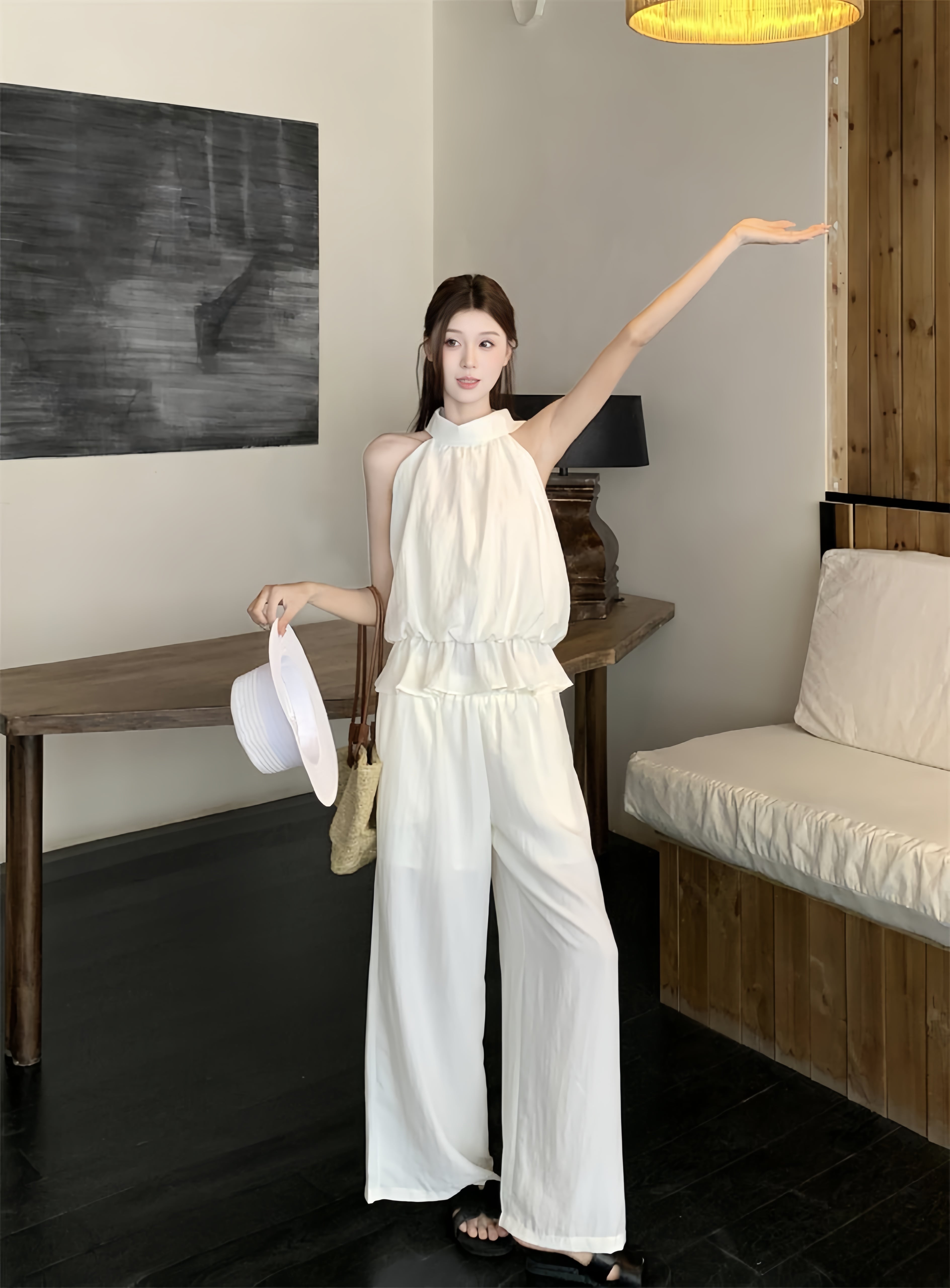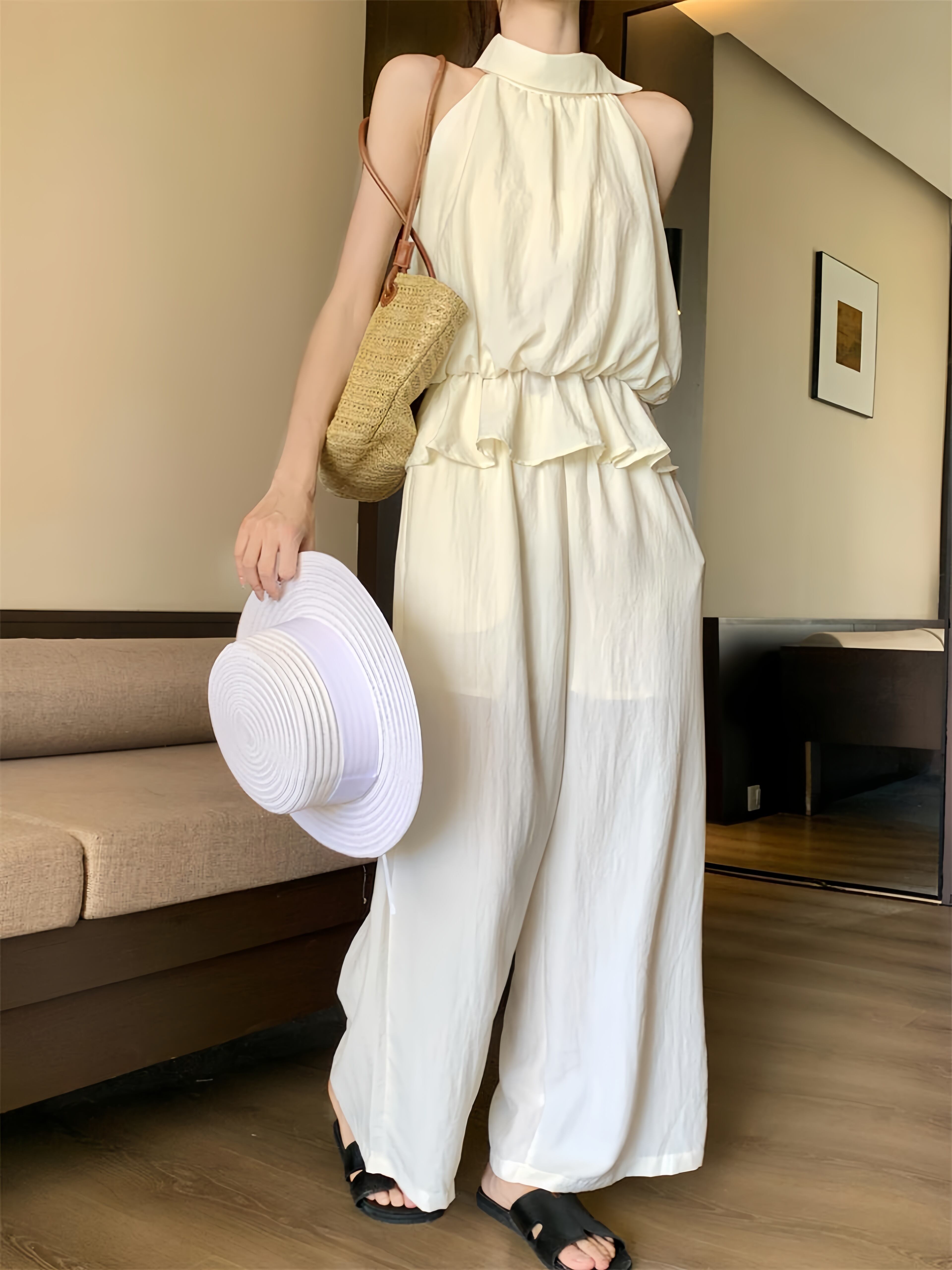 【set】ノースリーブフリルトップス×ワイドパンツセット M32595