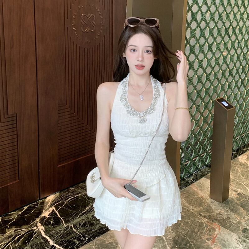 【set】ビジューホルターネックトップス×スカートセット M32657