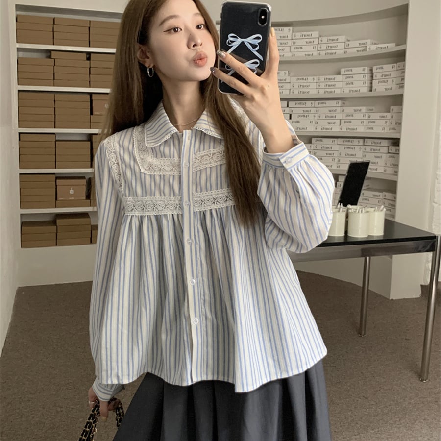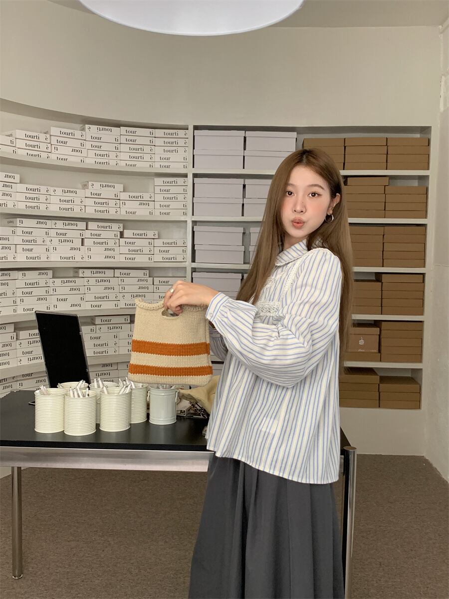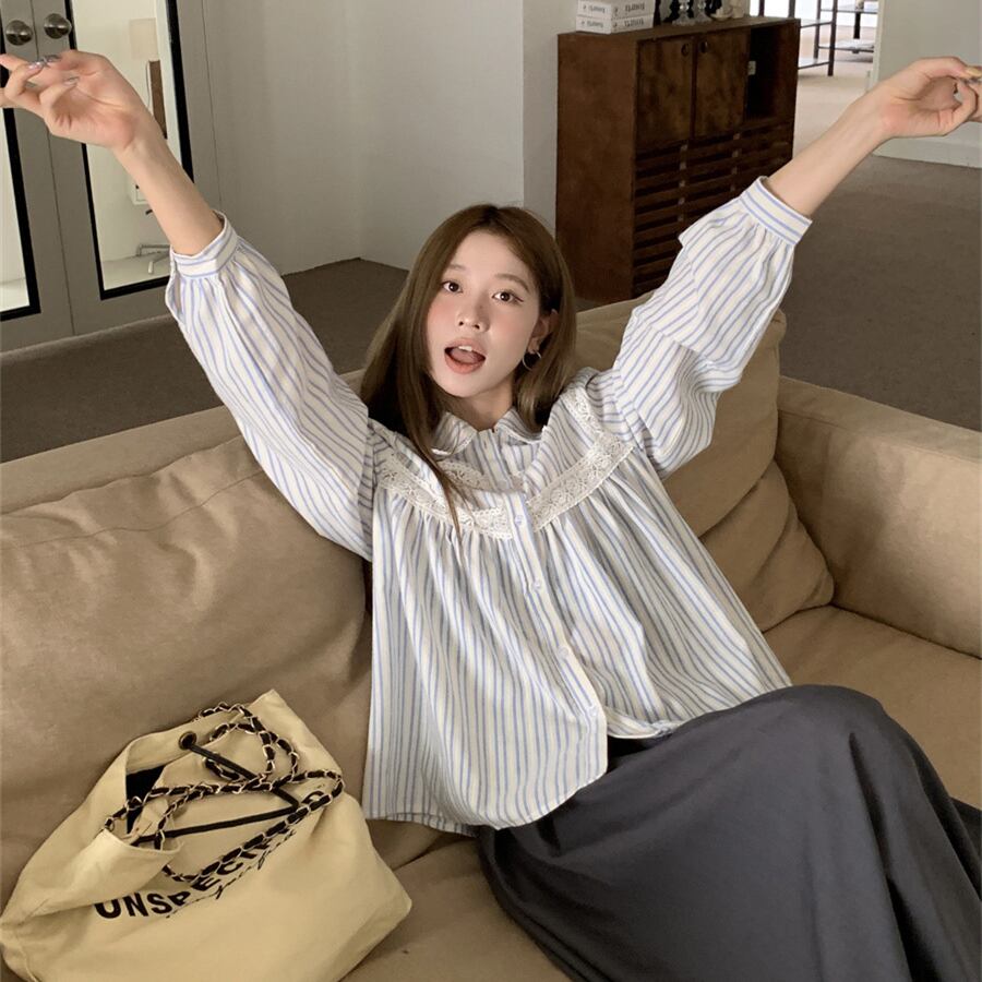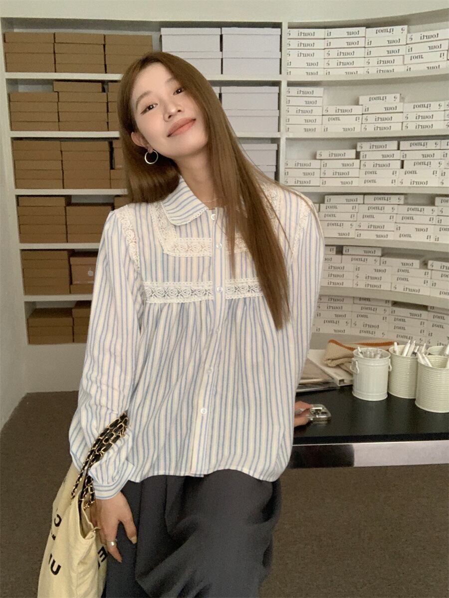 【tops】レースドッキングストライプ柄ブラウス M33238