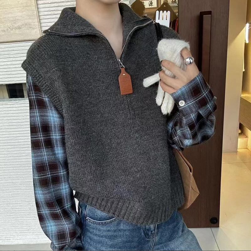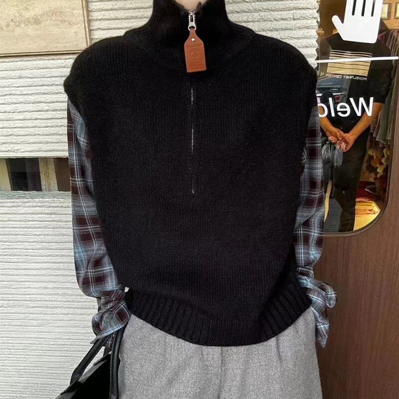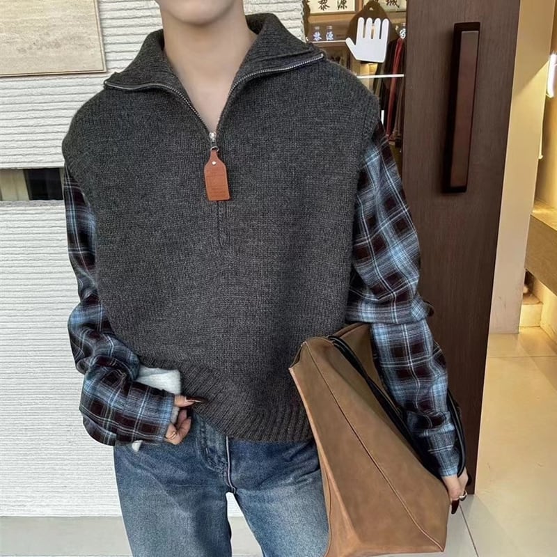 【tops】チェック柄袖ドッキングニットブラウス Q6256