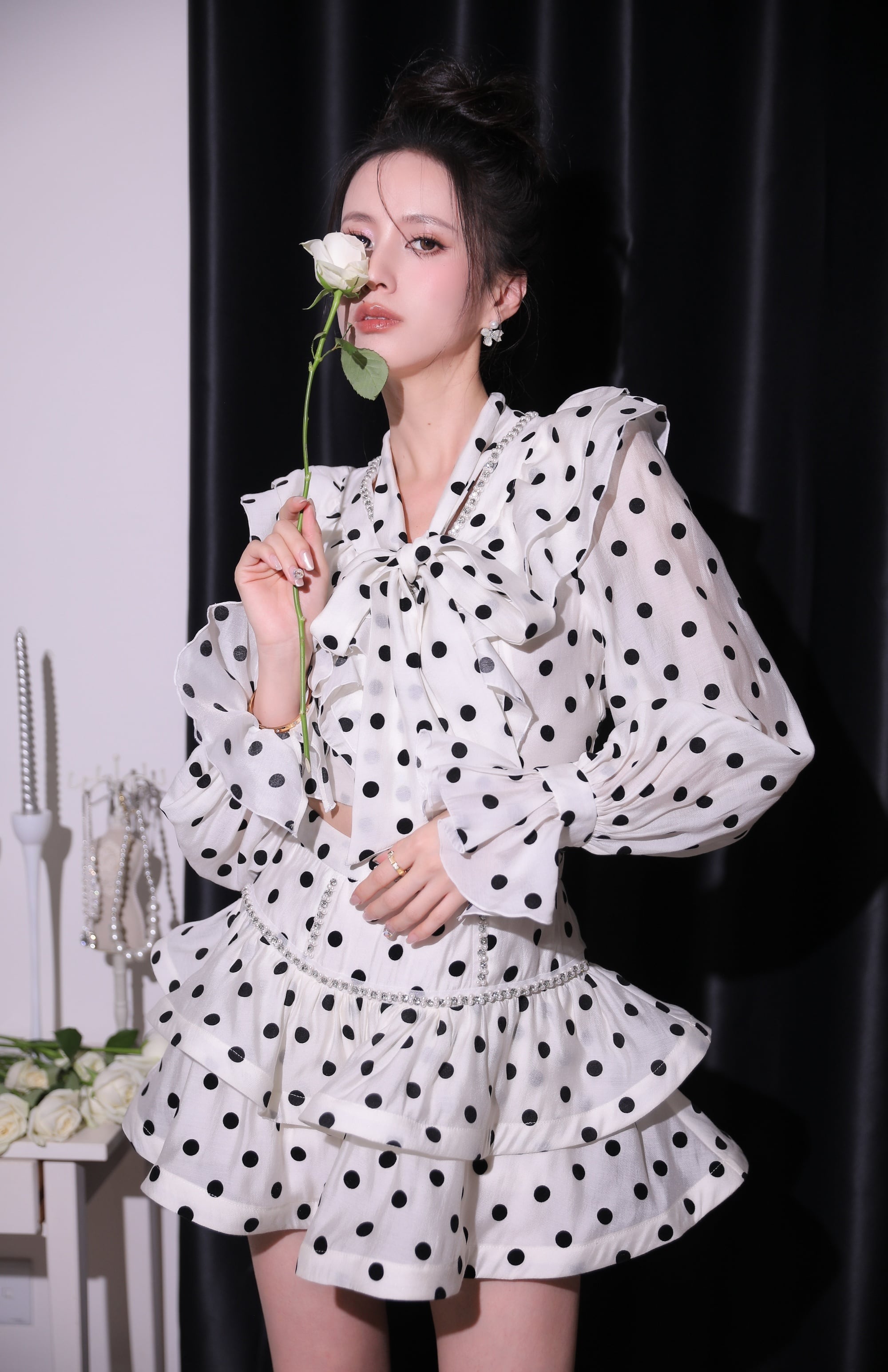 【set】パール付きドット柄フリルブラウス×ミニスカートセット N3294