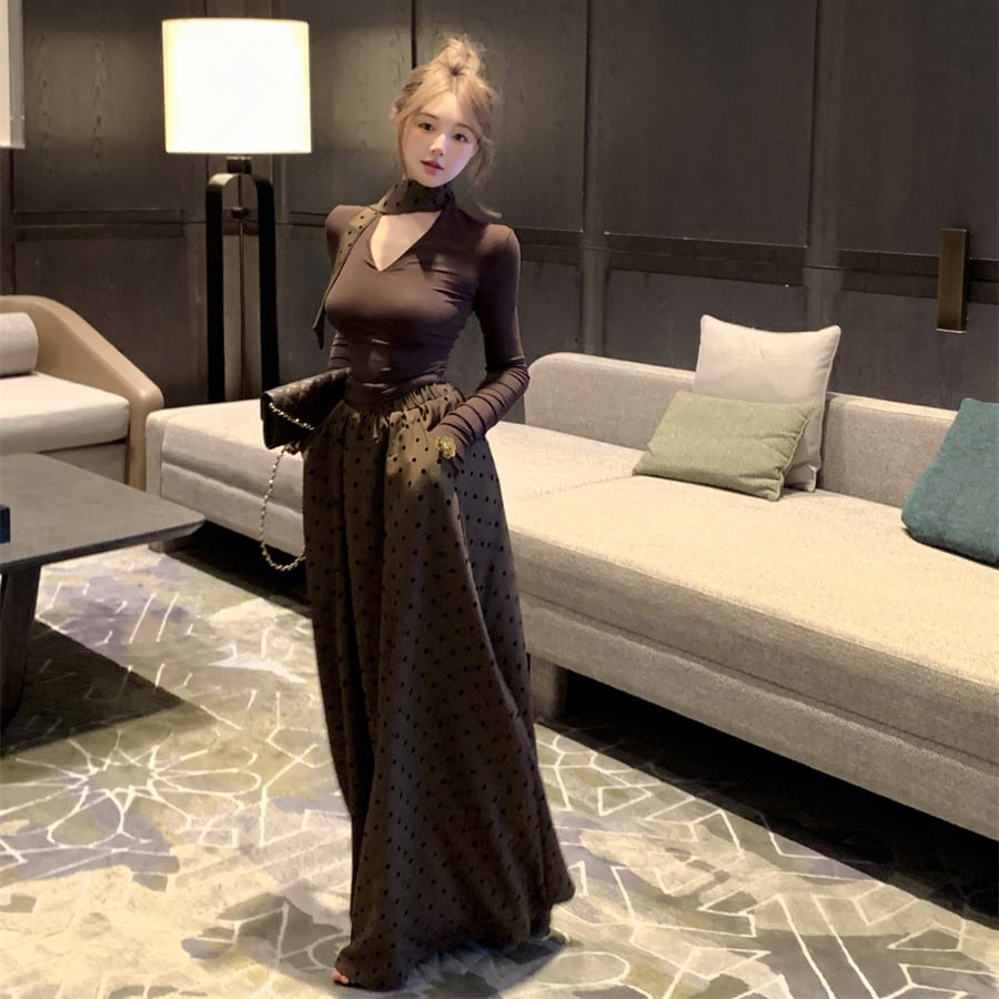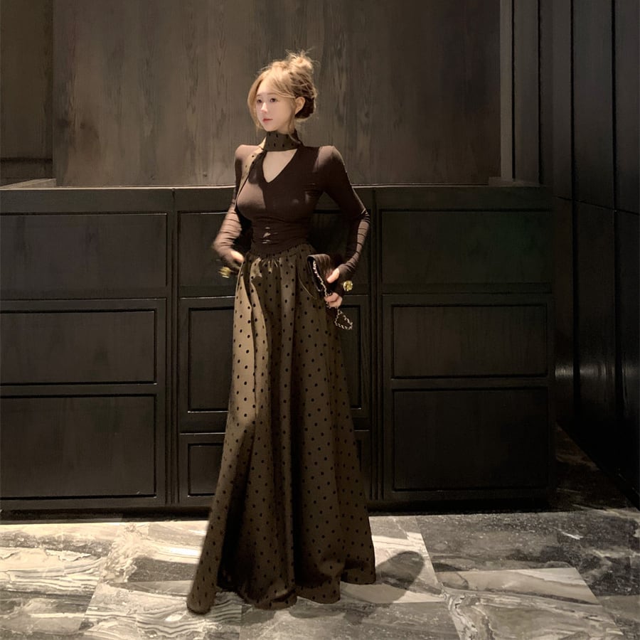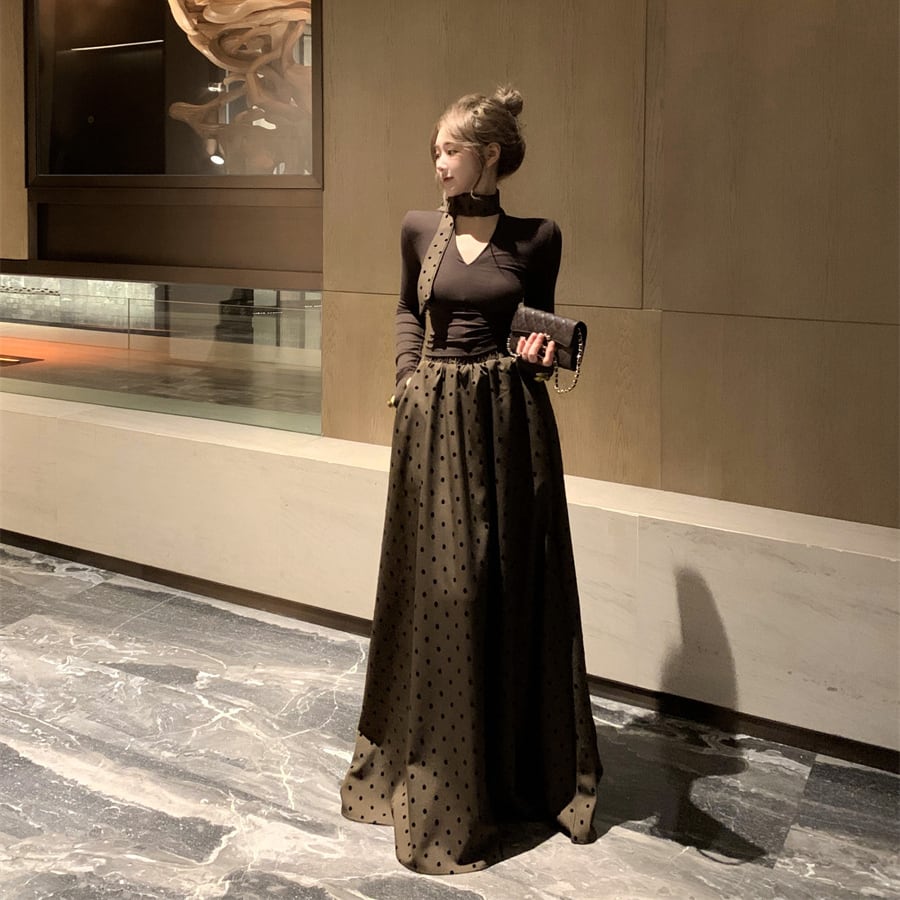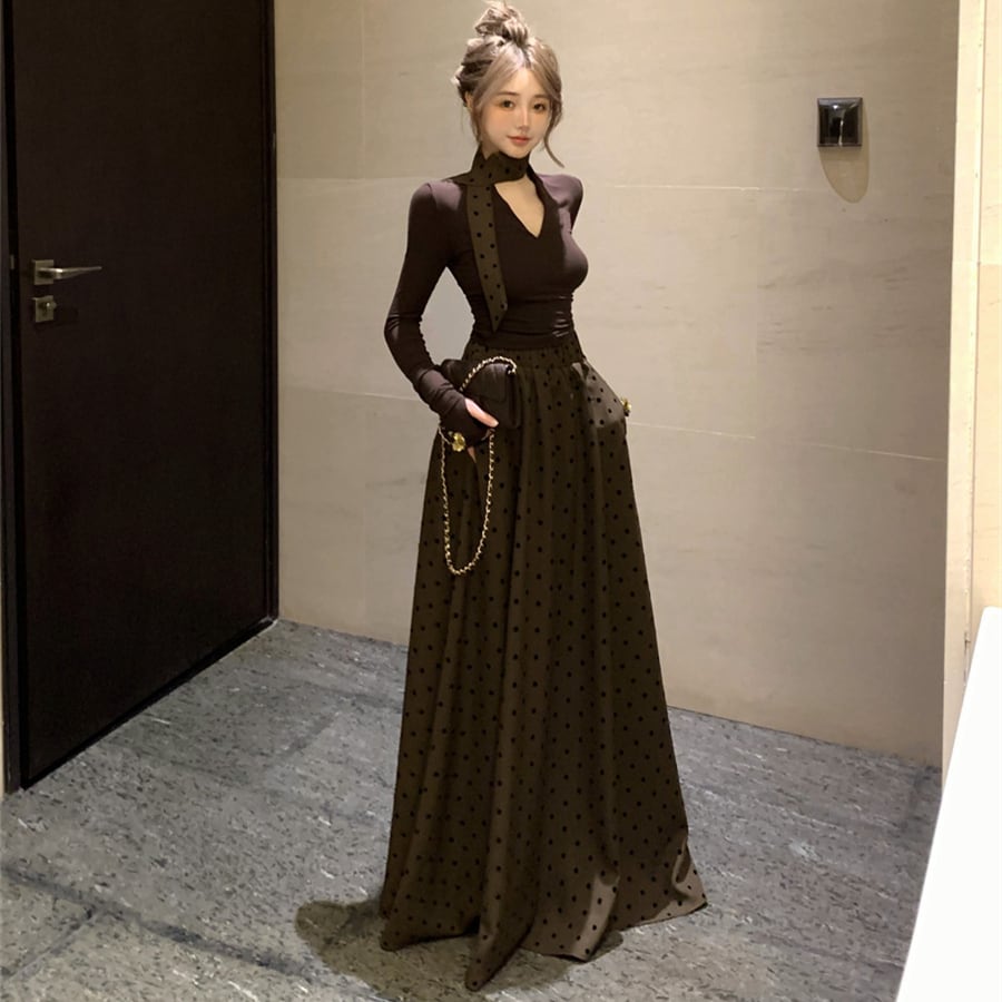 【set】Vネック長袖Tシャツ×ドット柄スカートセット M33532