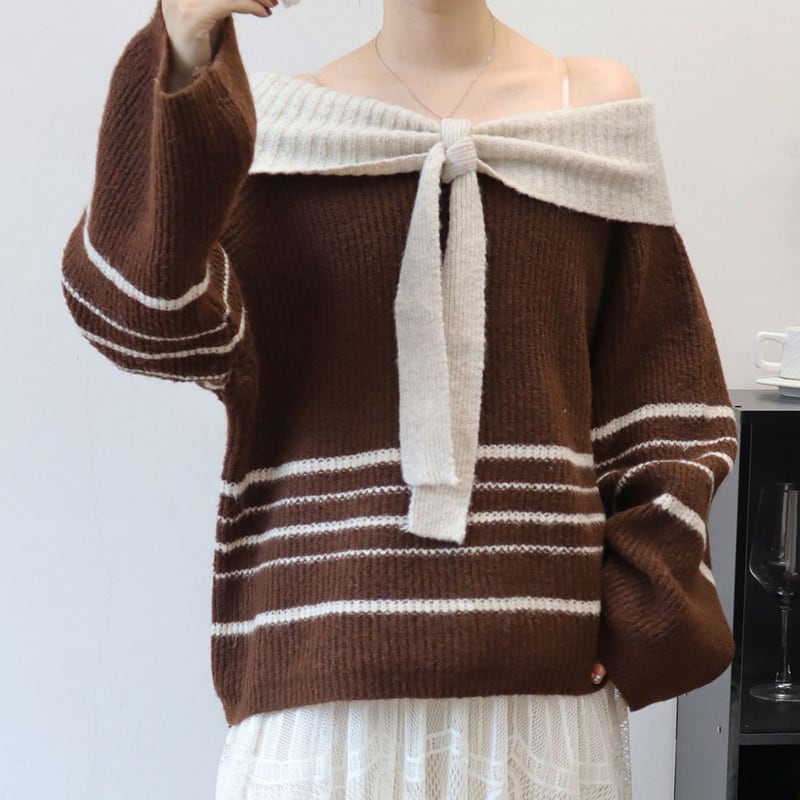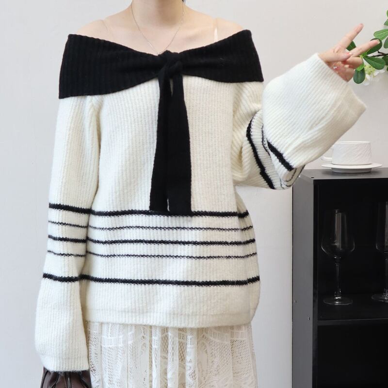 【tops】ビッグリボンオフショルダーセーター Q6336