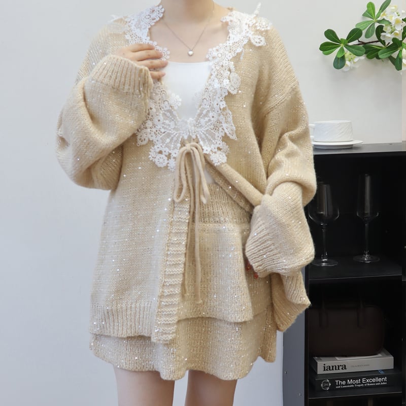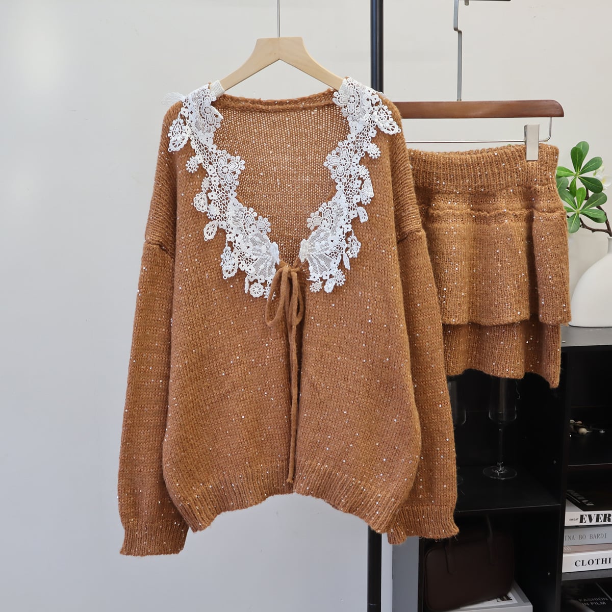 【set】レースドッキングカーディガン×ニットスカートセット Q6339