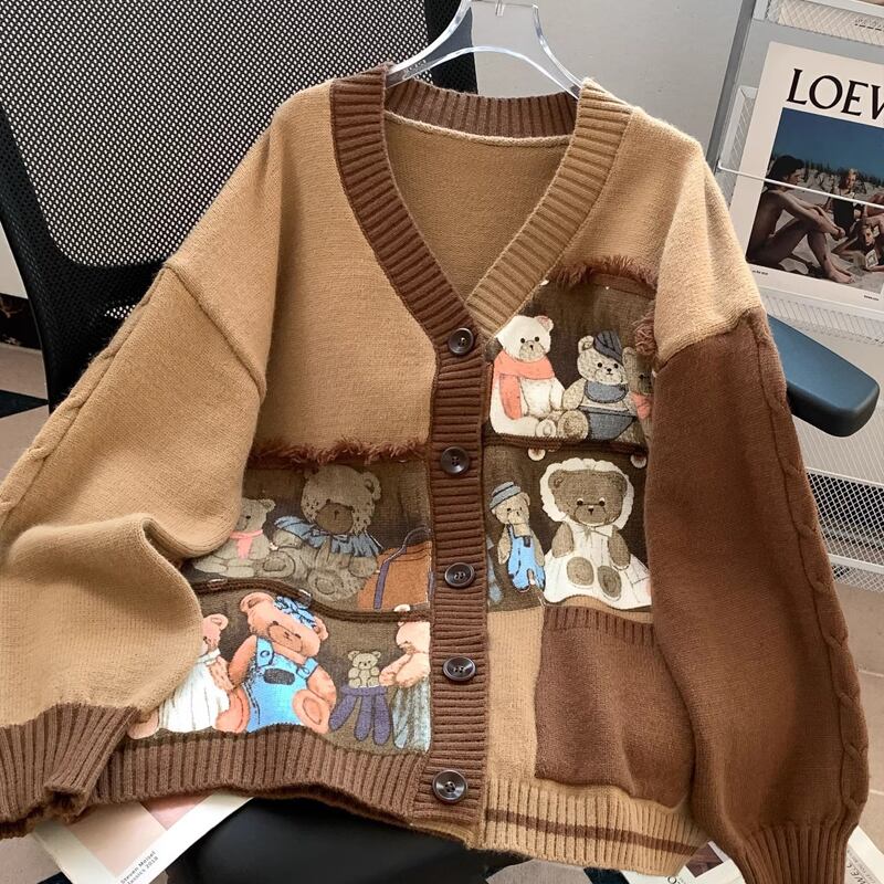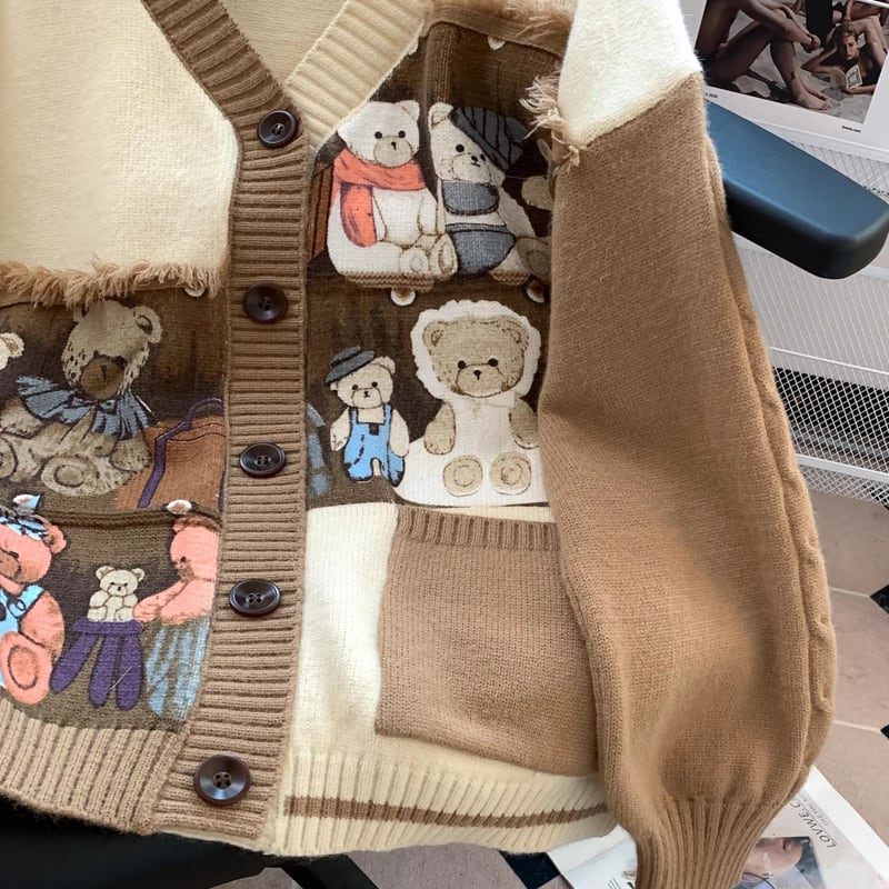 【outer】クマ柄ニットカーディガン Q6355