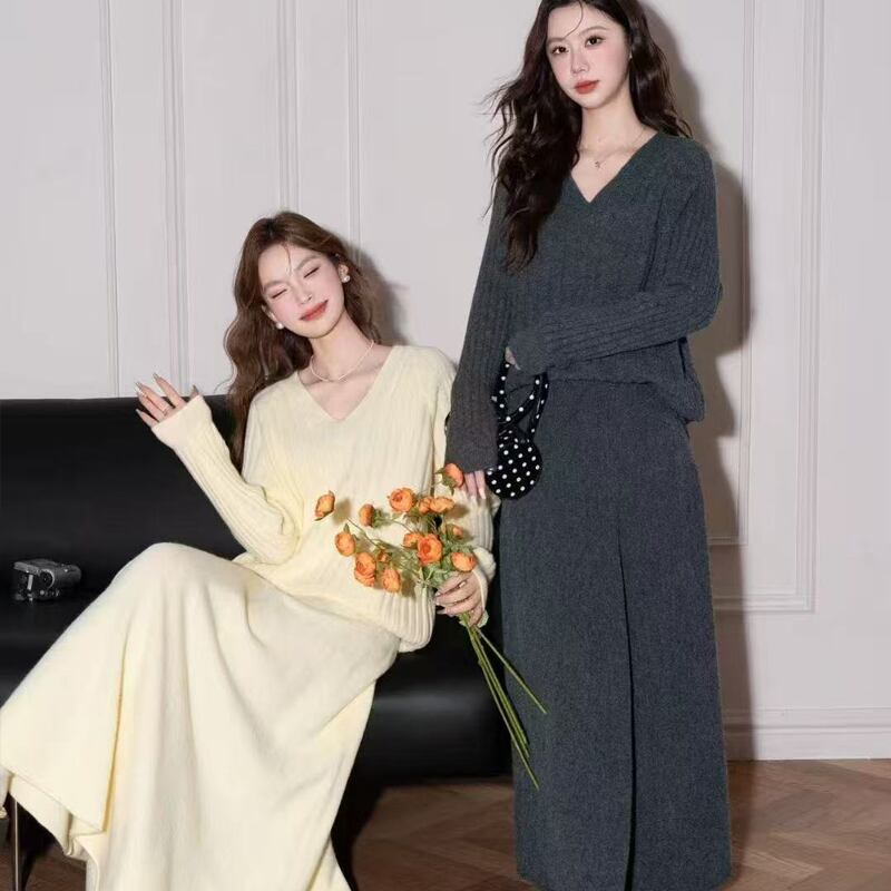 【set】Vネックニットトップス×ロングスカートセット Q6394