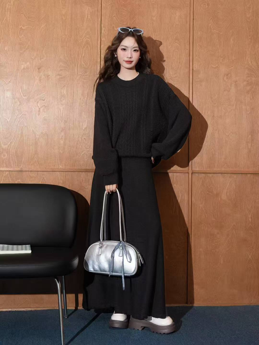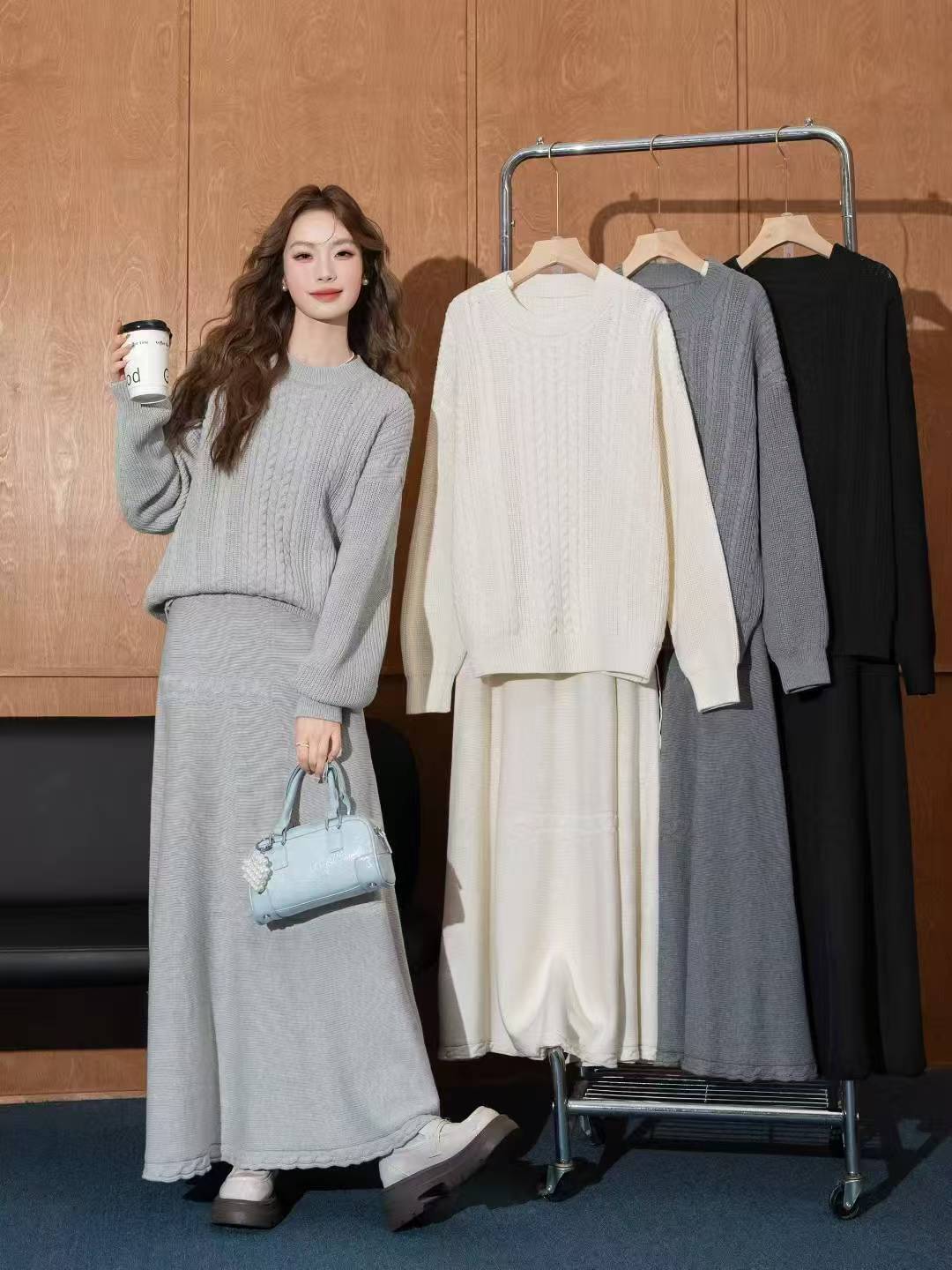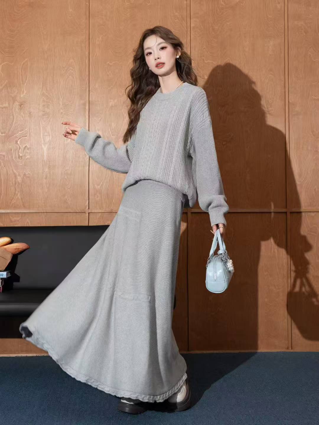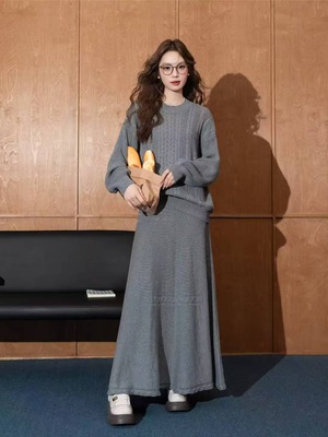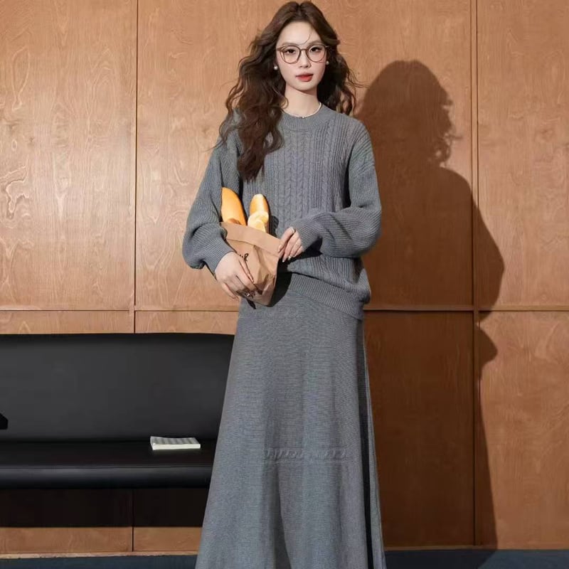 【set】丸首セーター×ロングスカートセット Q6395