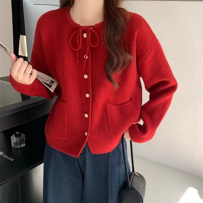 【outer】リボン付きニットカーディガン Q6402
