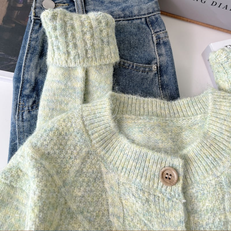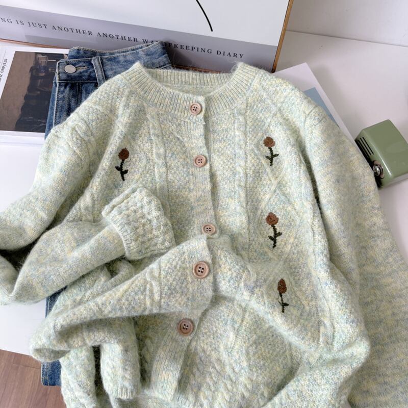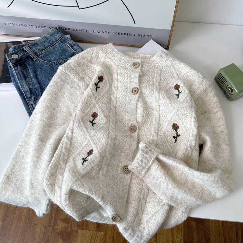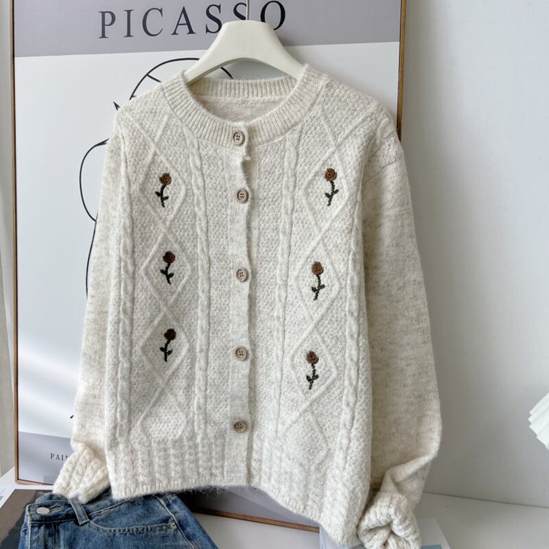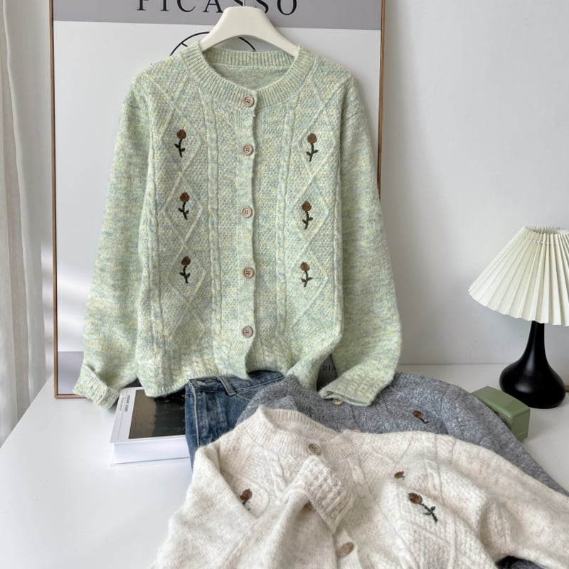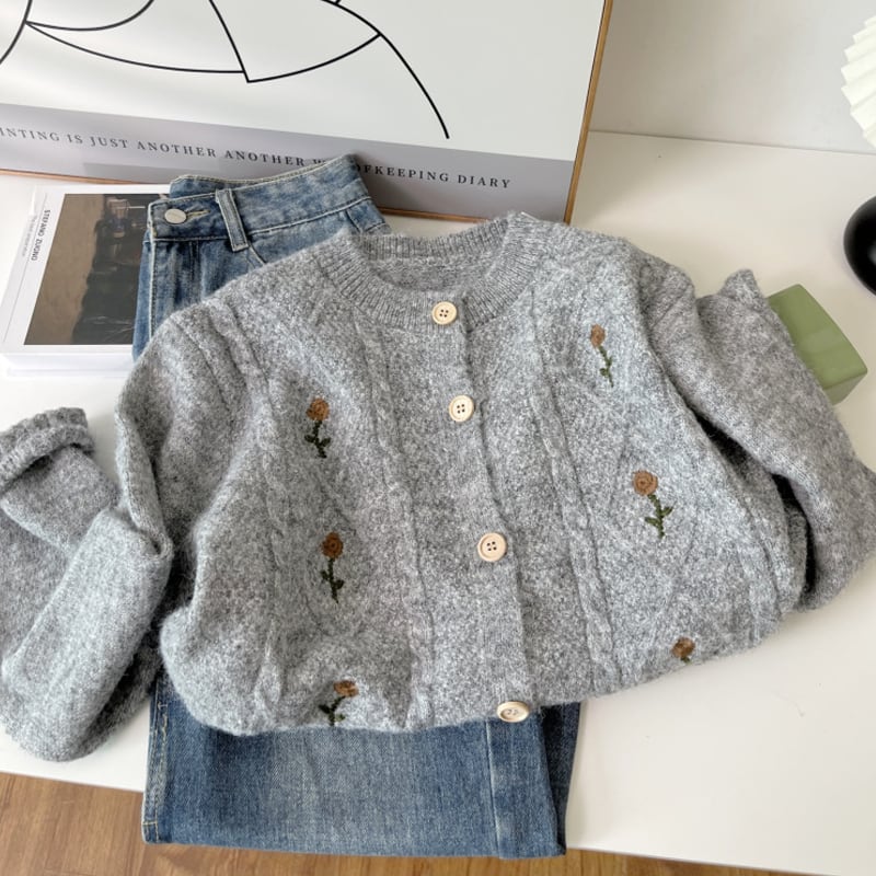 【outer】丸首刺繍柄ニットカーディガン Q6407