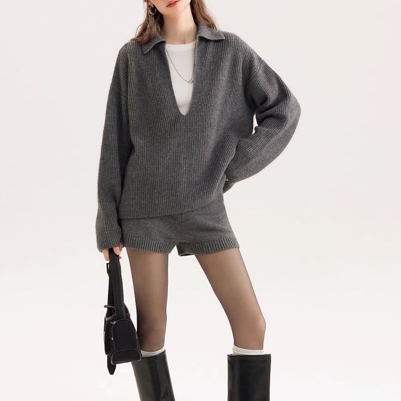 【set】Vネックセーター×ショートパンツセット Q6432