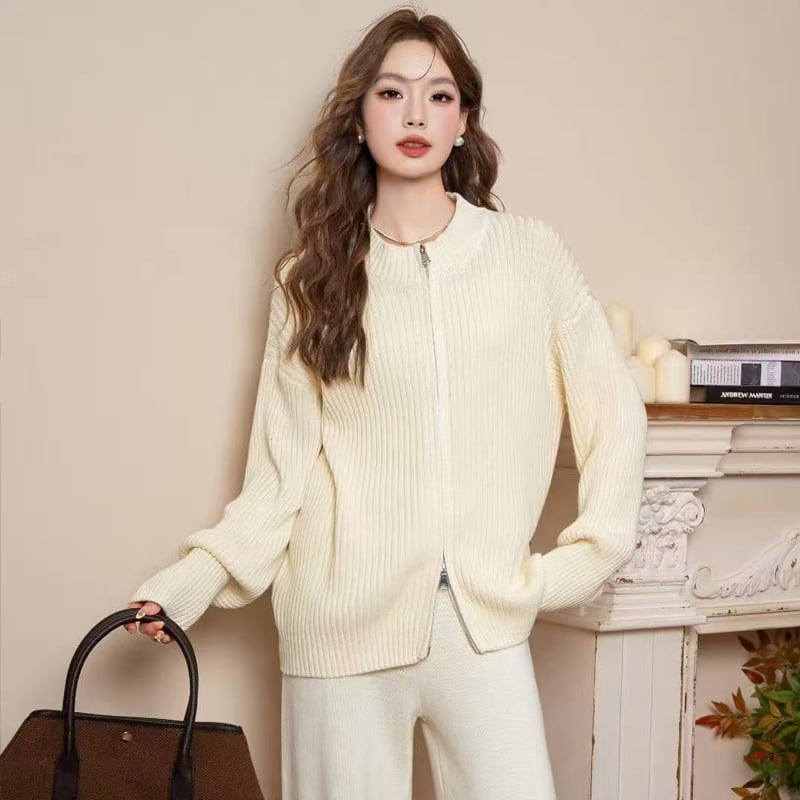 【set】丸首Wジップカーディガン×パンツセット Q6436