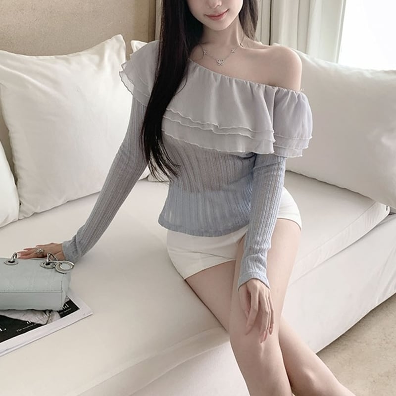 【tops】オフショルダーチュールドッキングニットトップス Q6443