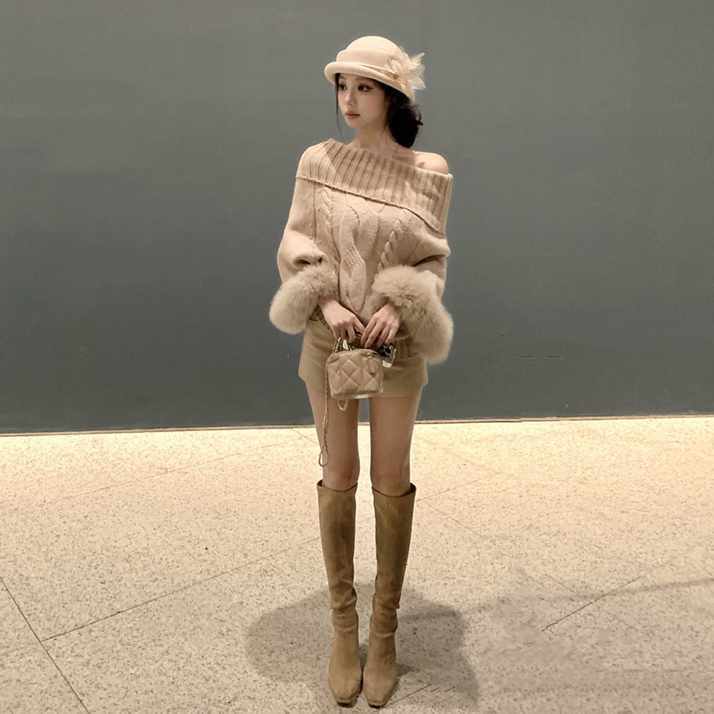 【tops】2WAY袖ファーオフショルニットトップス N3378