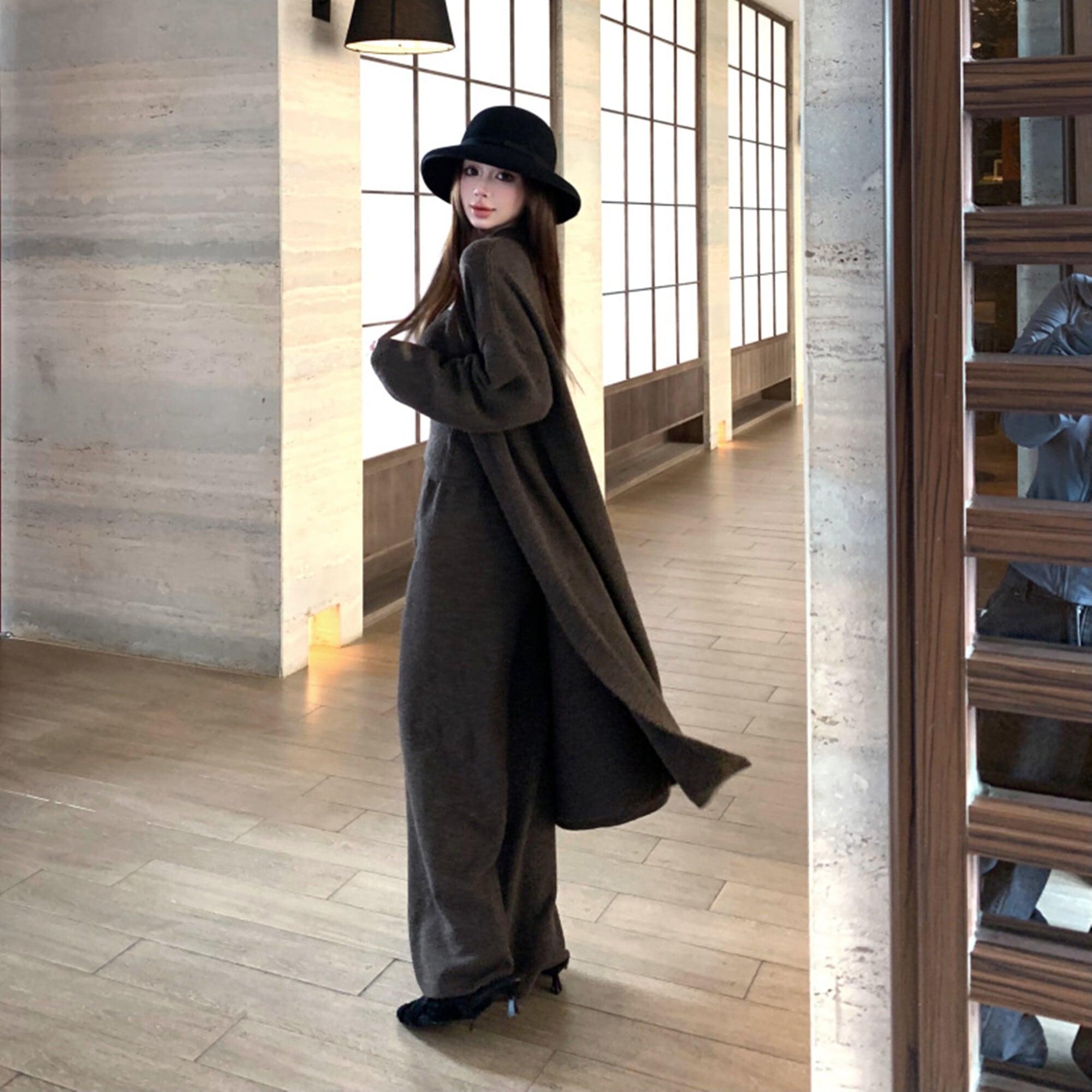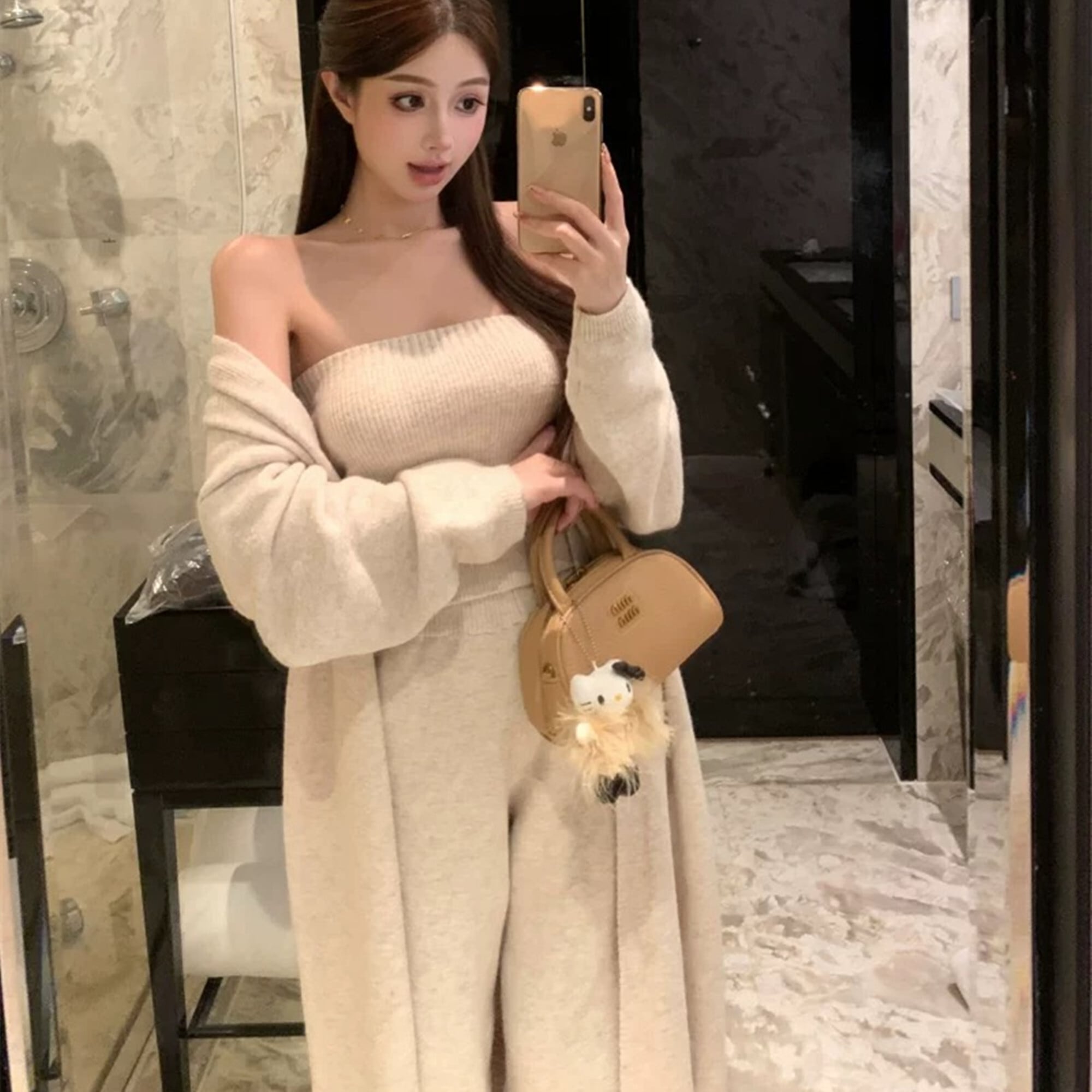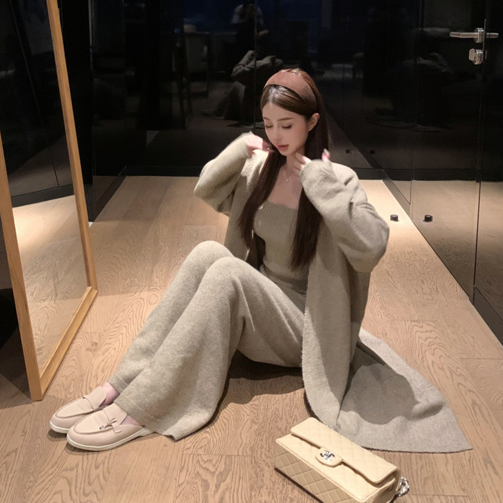 【set】ロング丈カーディガン×ベアトップ×ワイドパンツ3点セット N3329