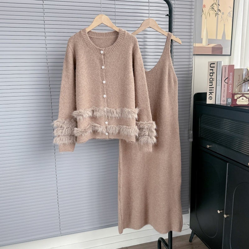 【set】ファー付きカーディガン×ノースリーブワンピセット Q6586