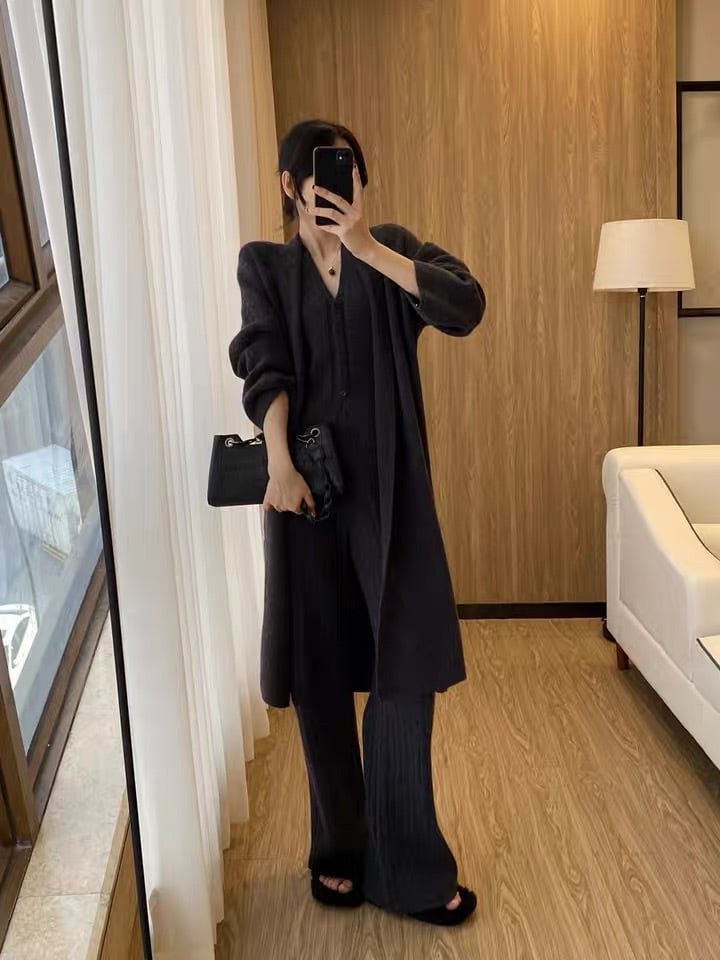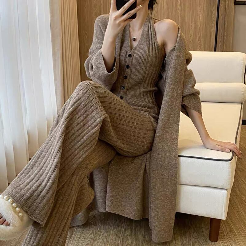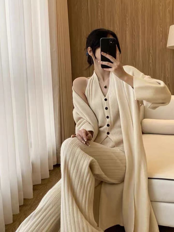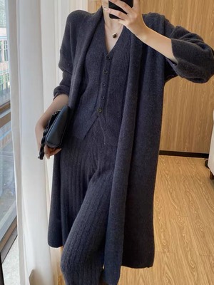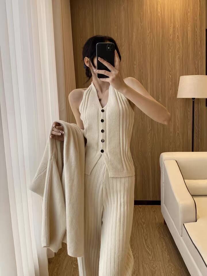 【set】ニットベスト×カーディガン×ワイドパンツ3点セット Q6615