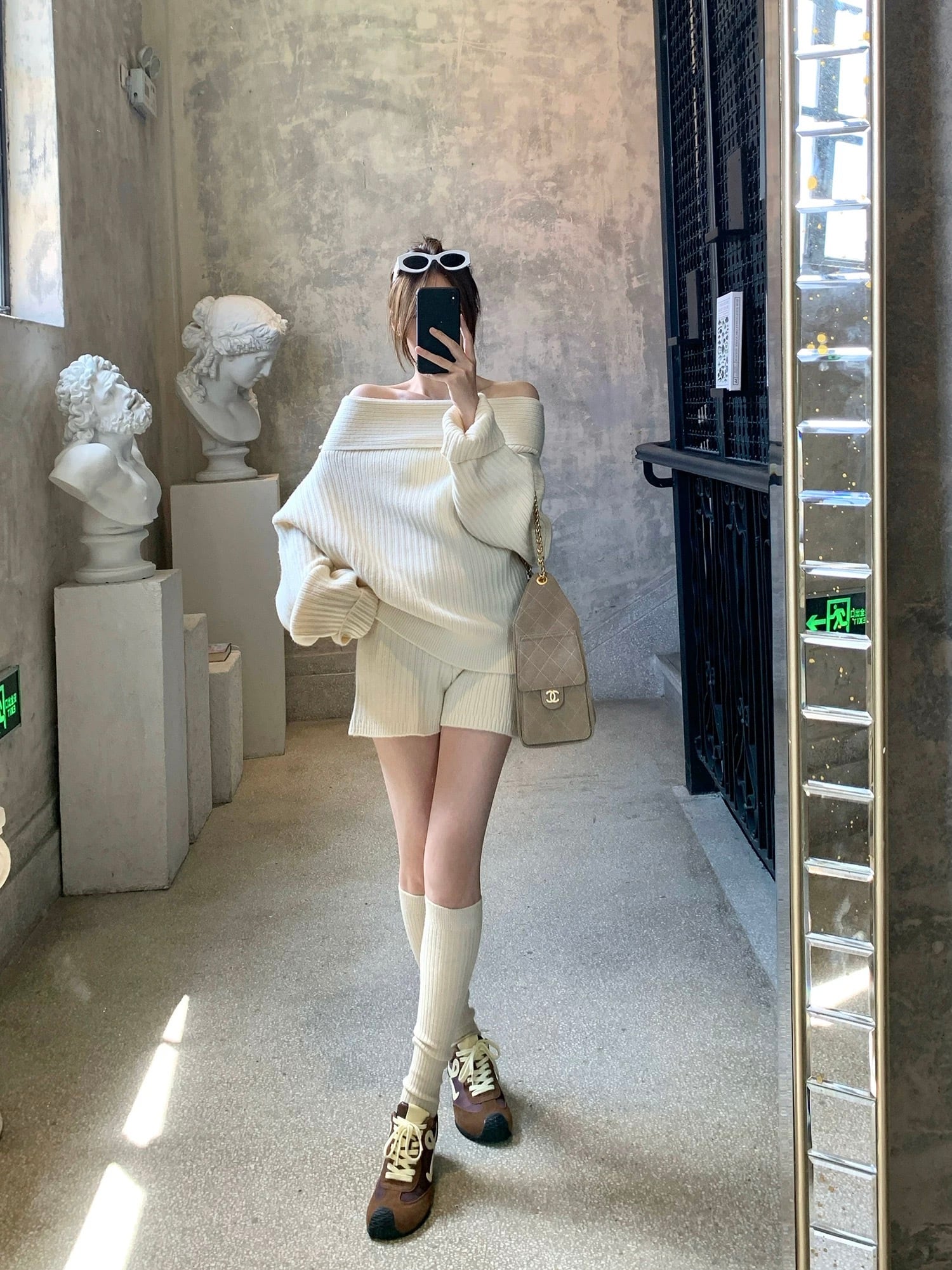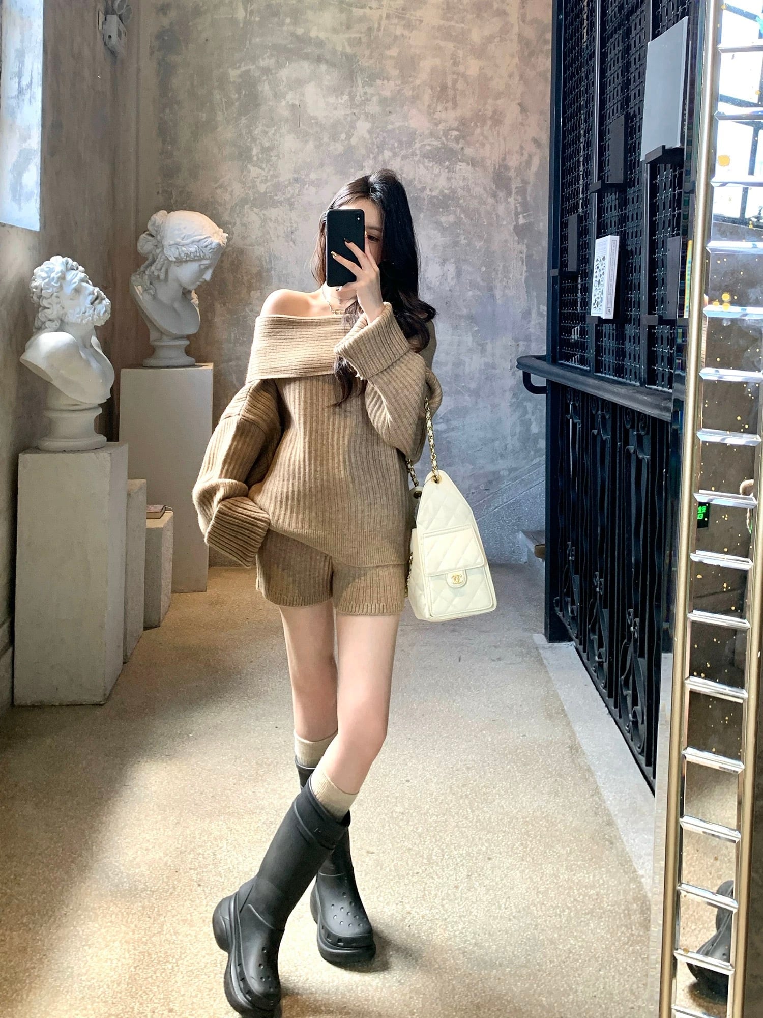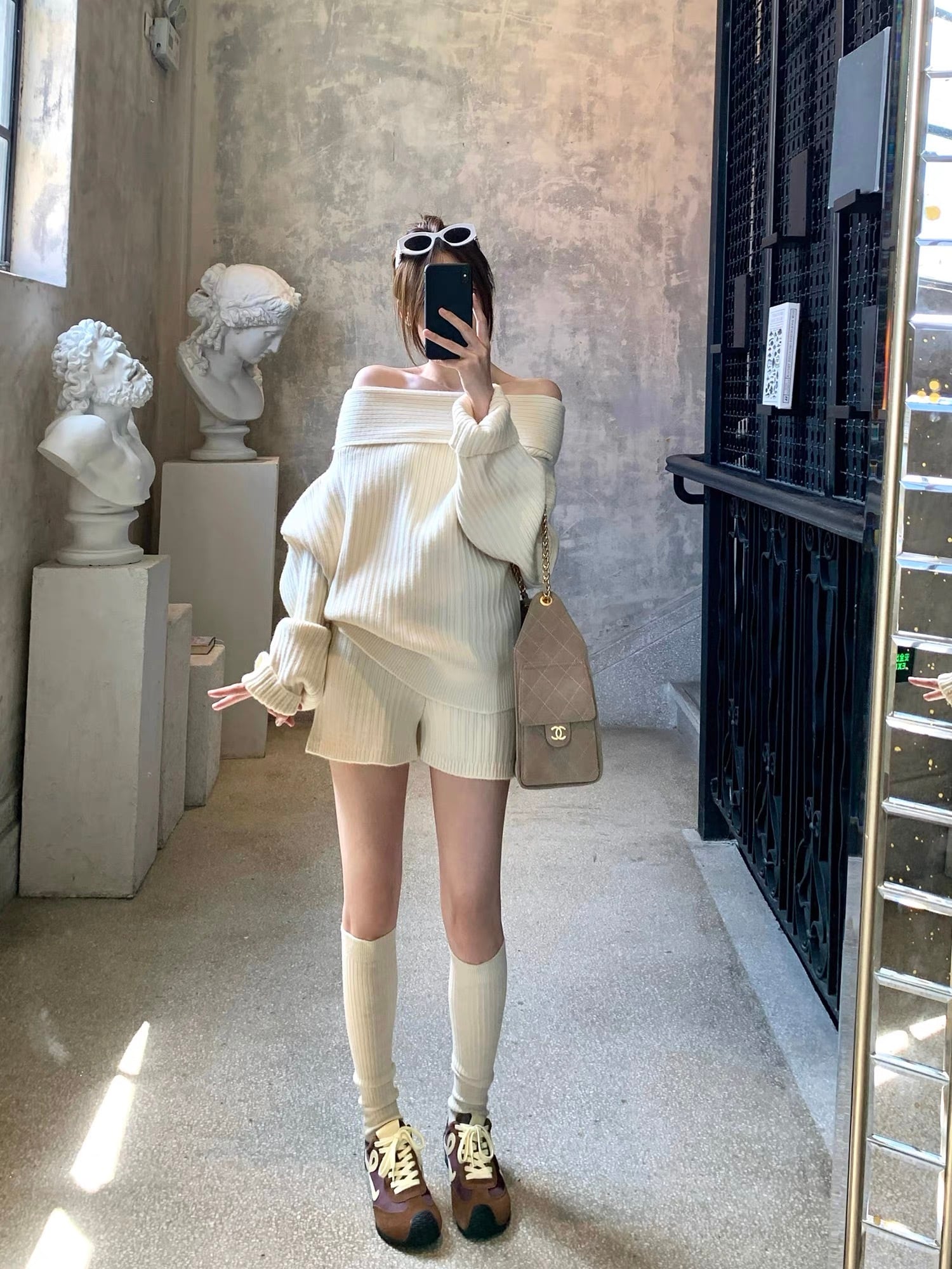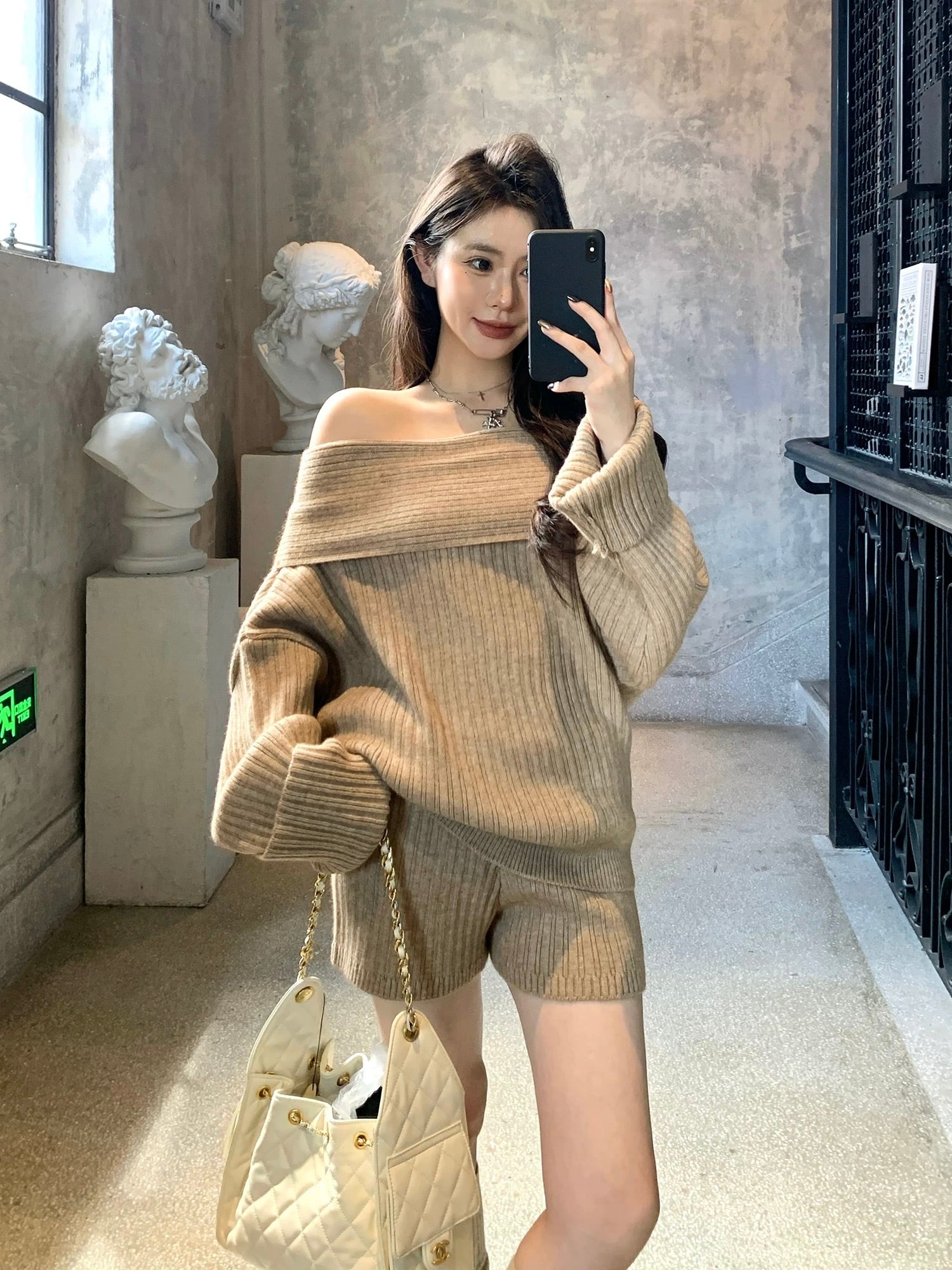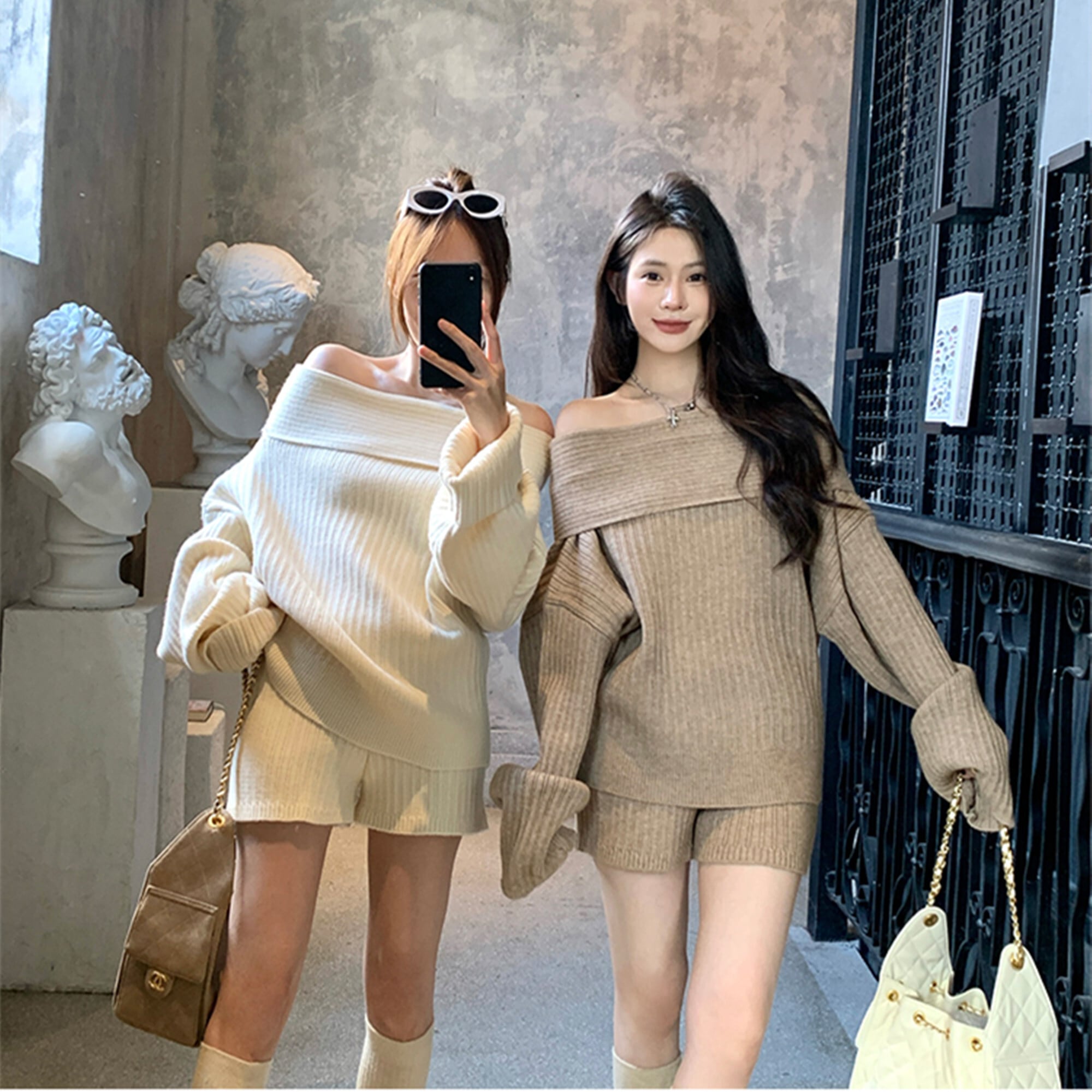 【set】オフショルニットトップス×ショートパンツセット N3357