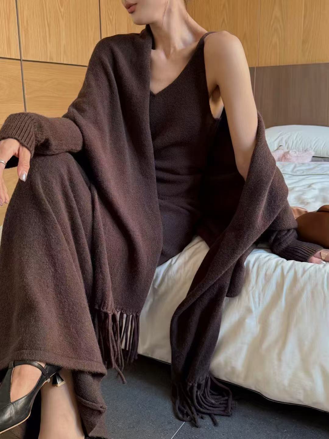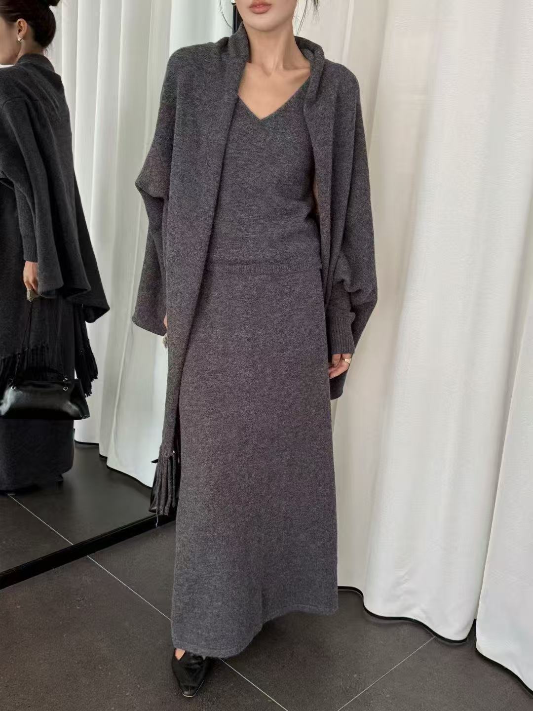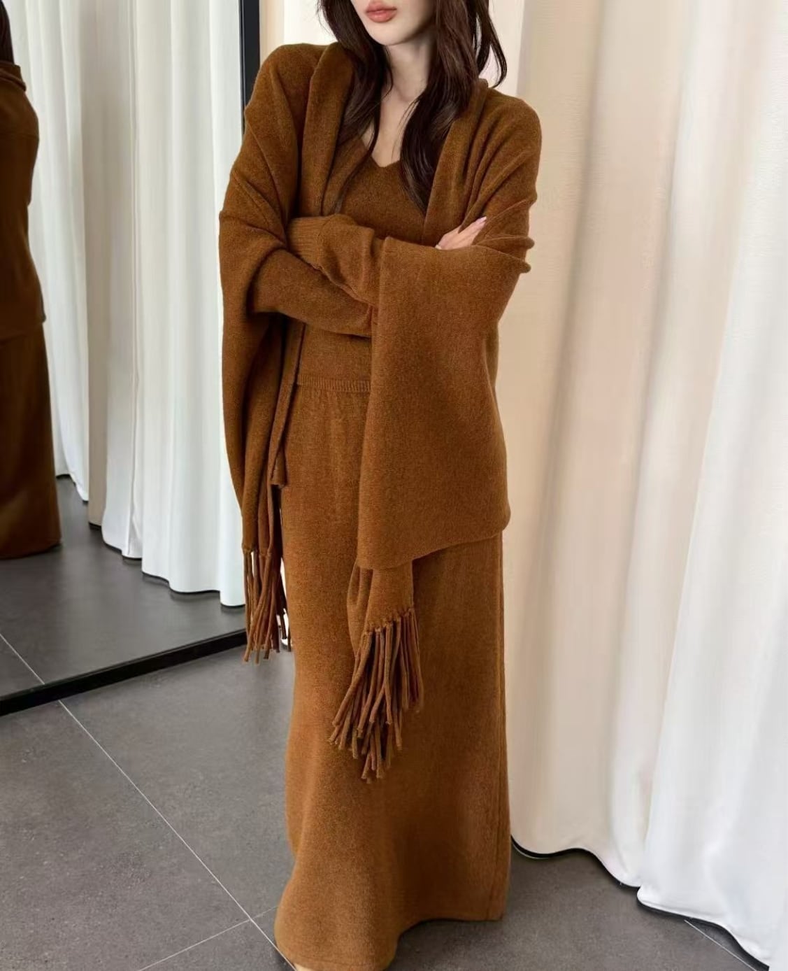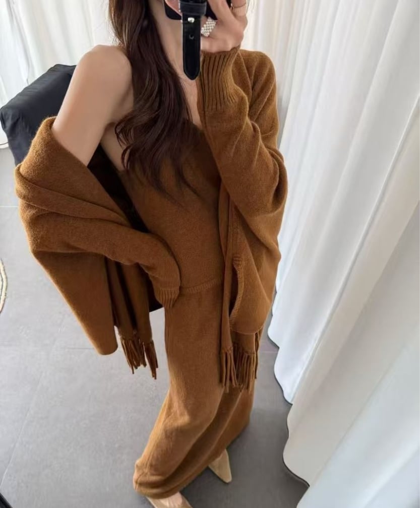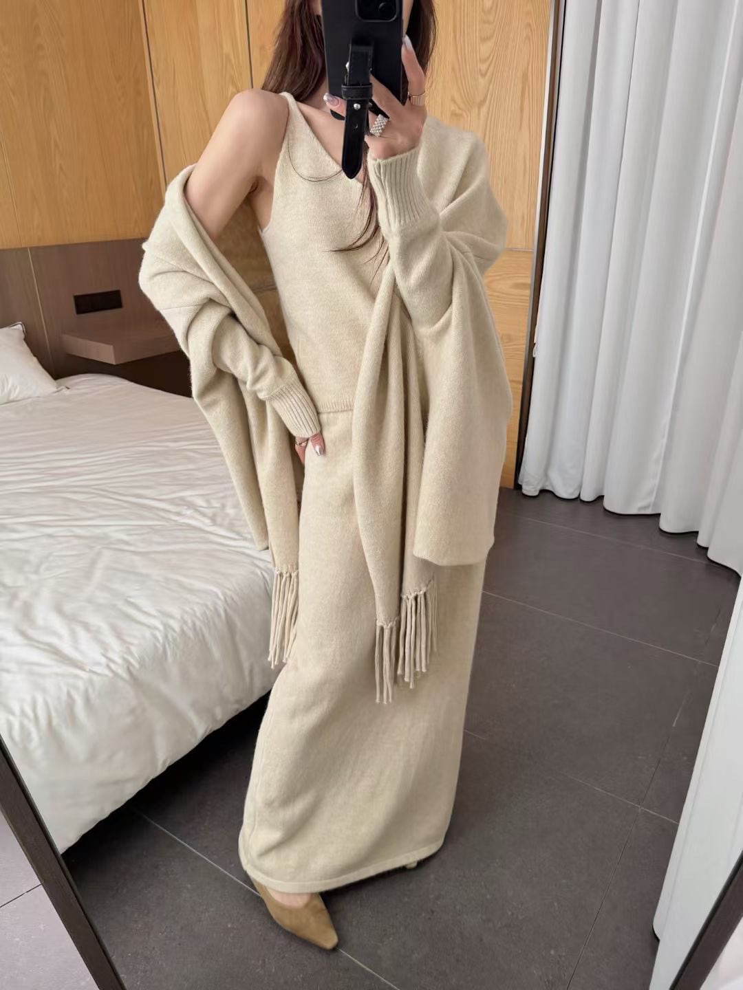 【set】フリンジニットストールxニットキャミソールxニットスカート3点セット K0513