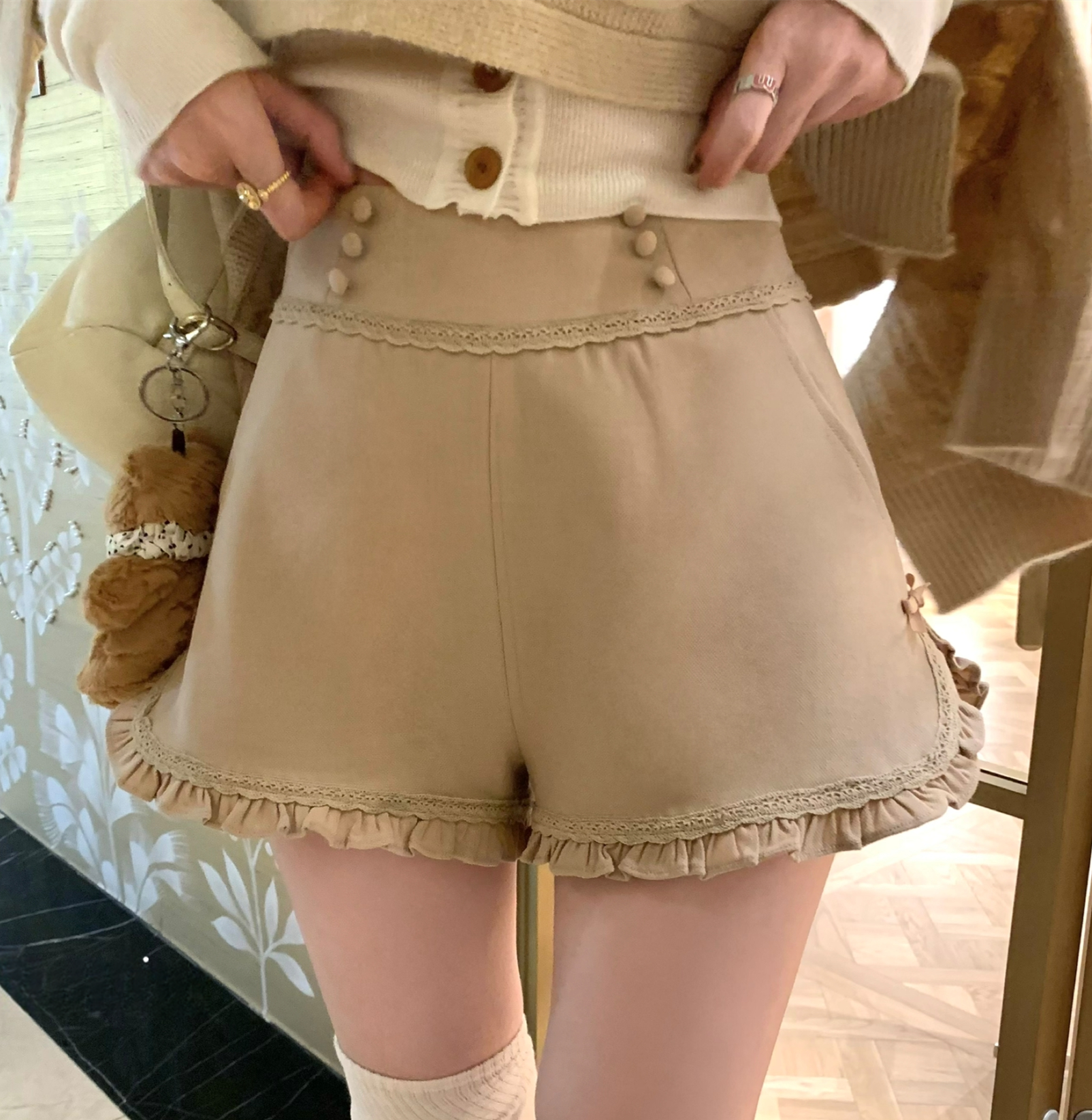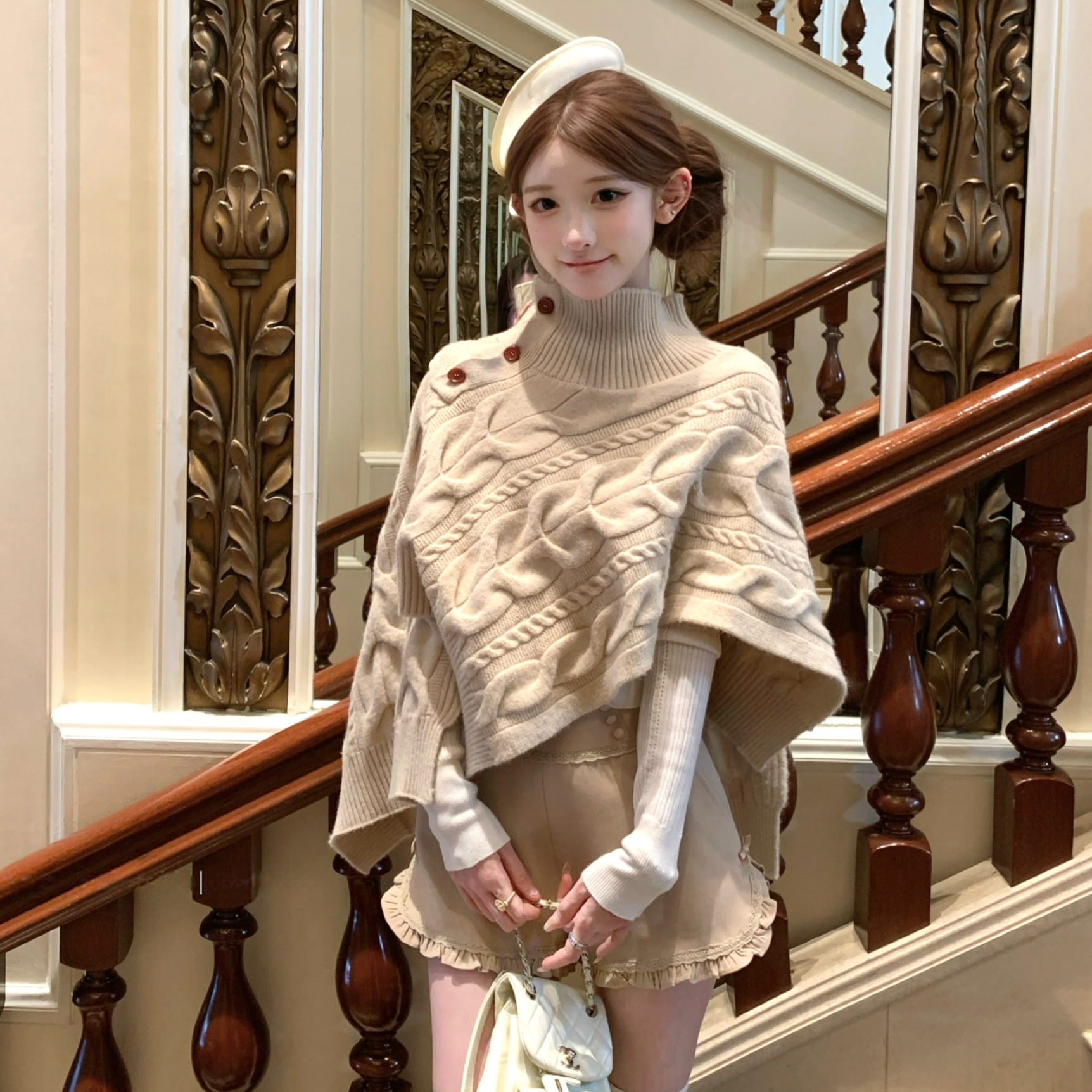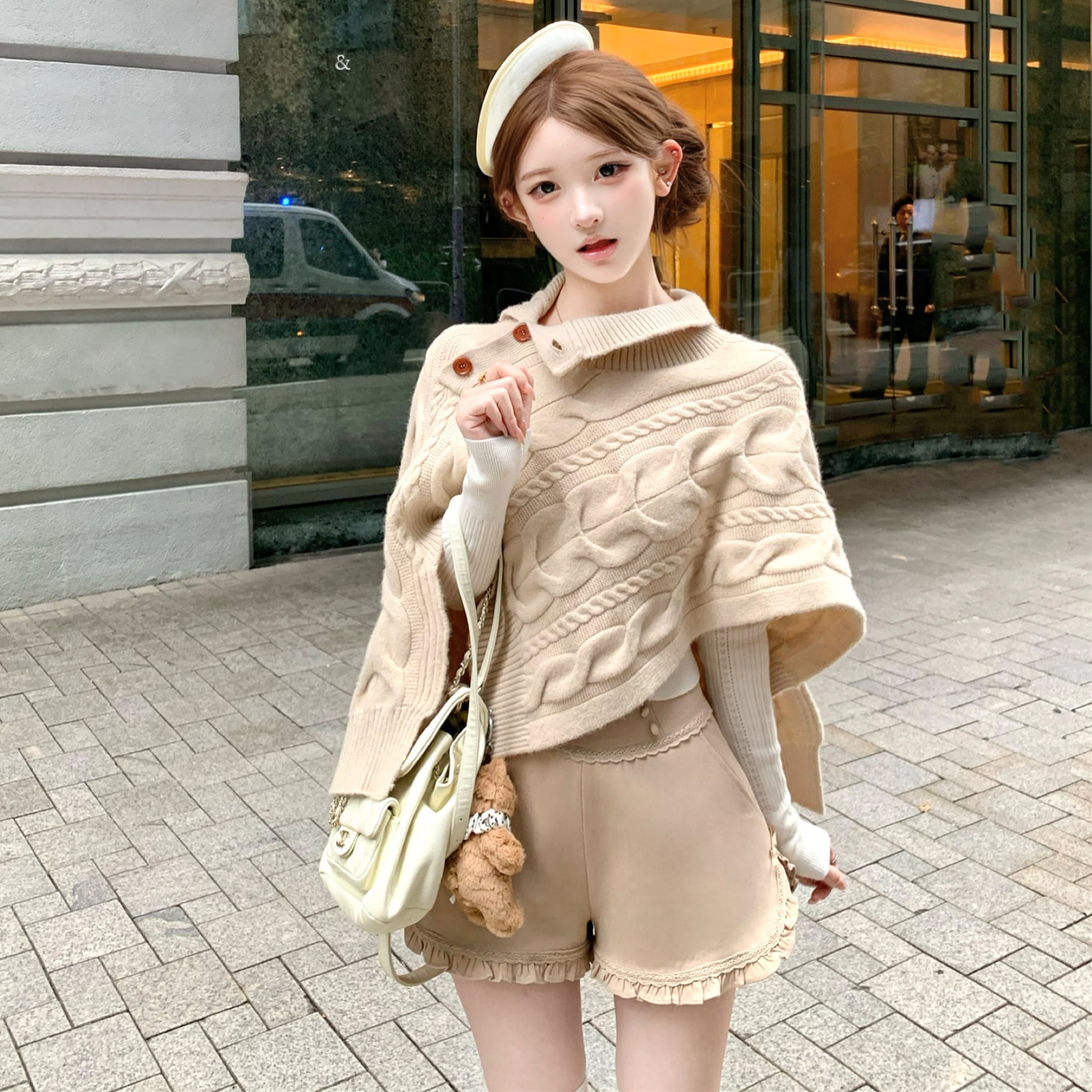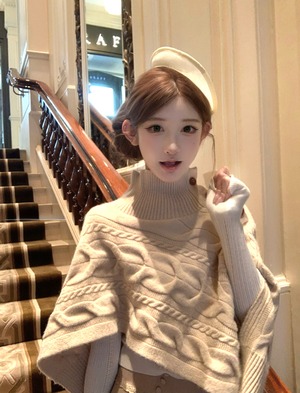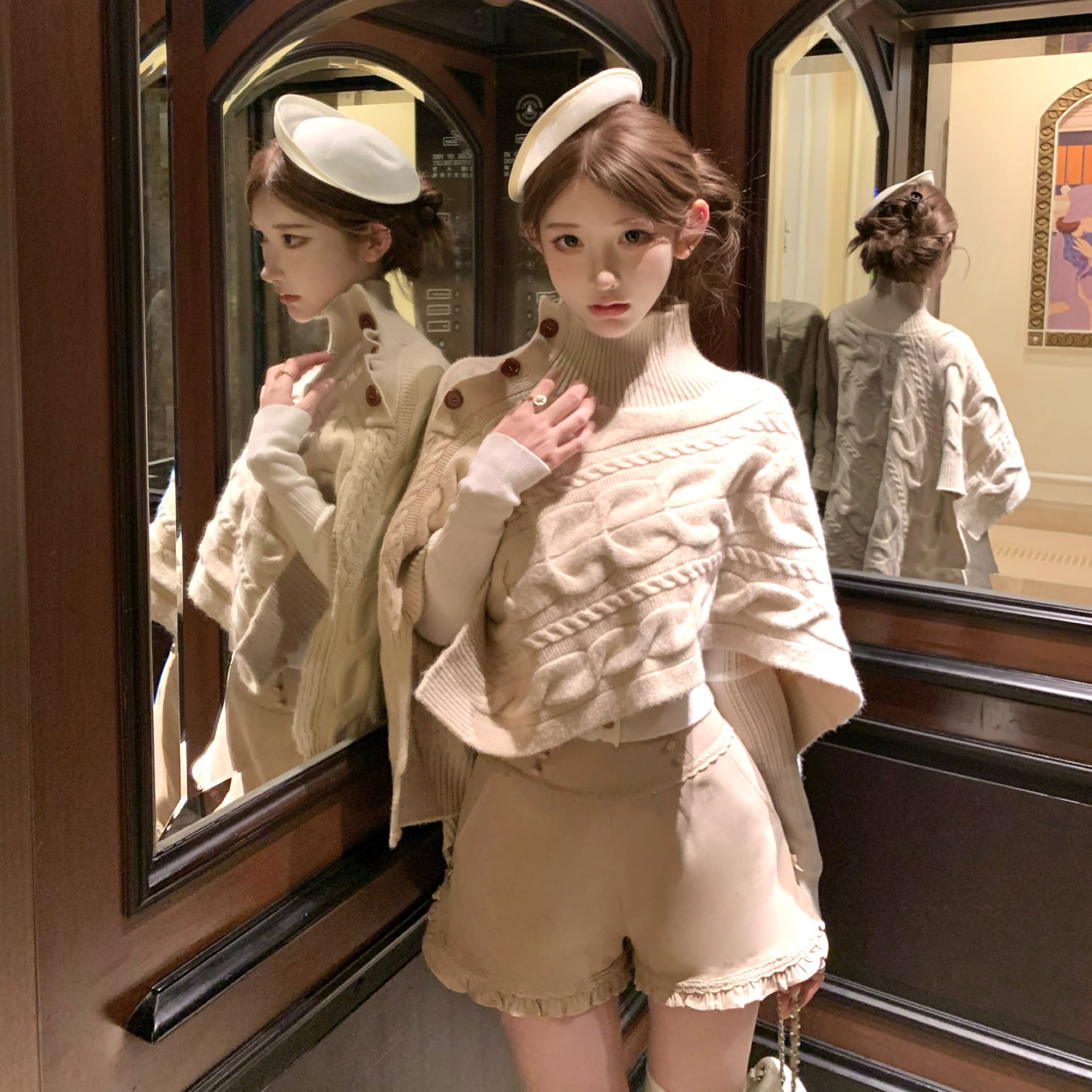 【set】ハイネックニットケープトップス×フリルショートパンツセット N3388