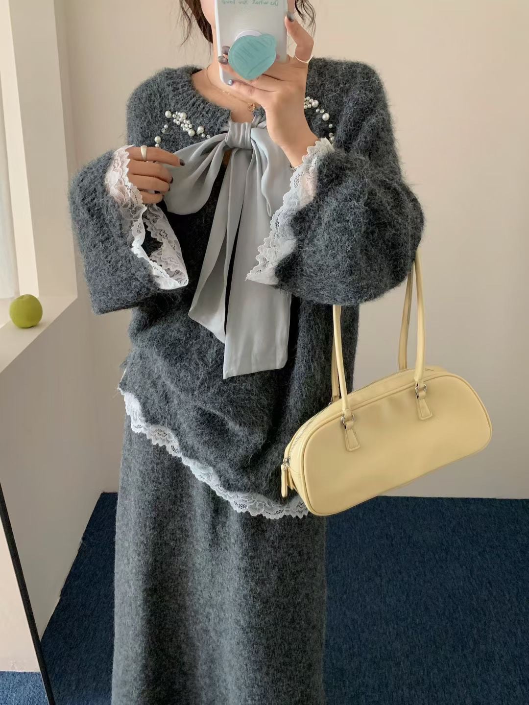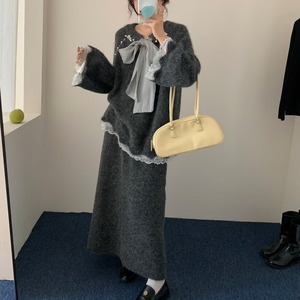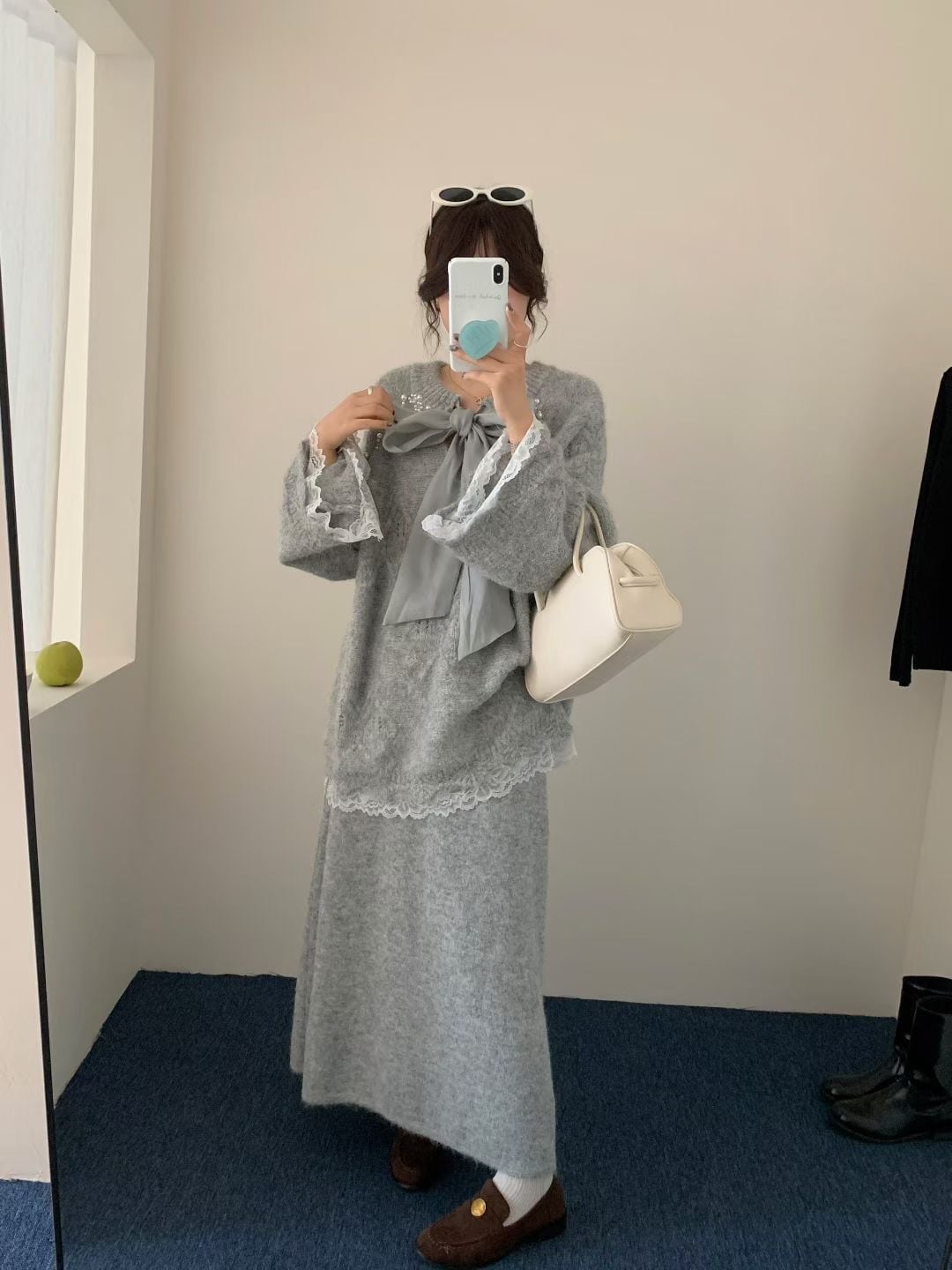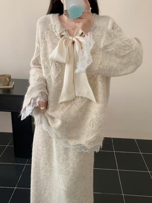 【set】レースドッキングニットトップス×スカートセット Q6764