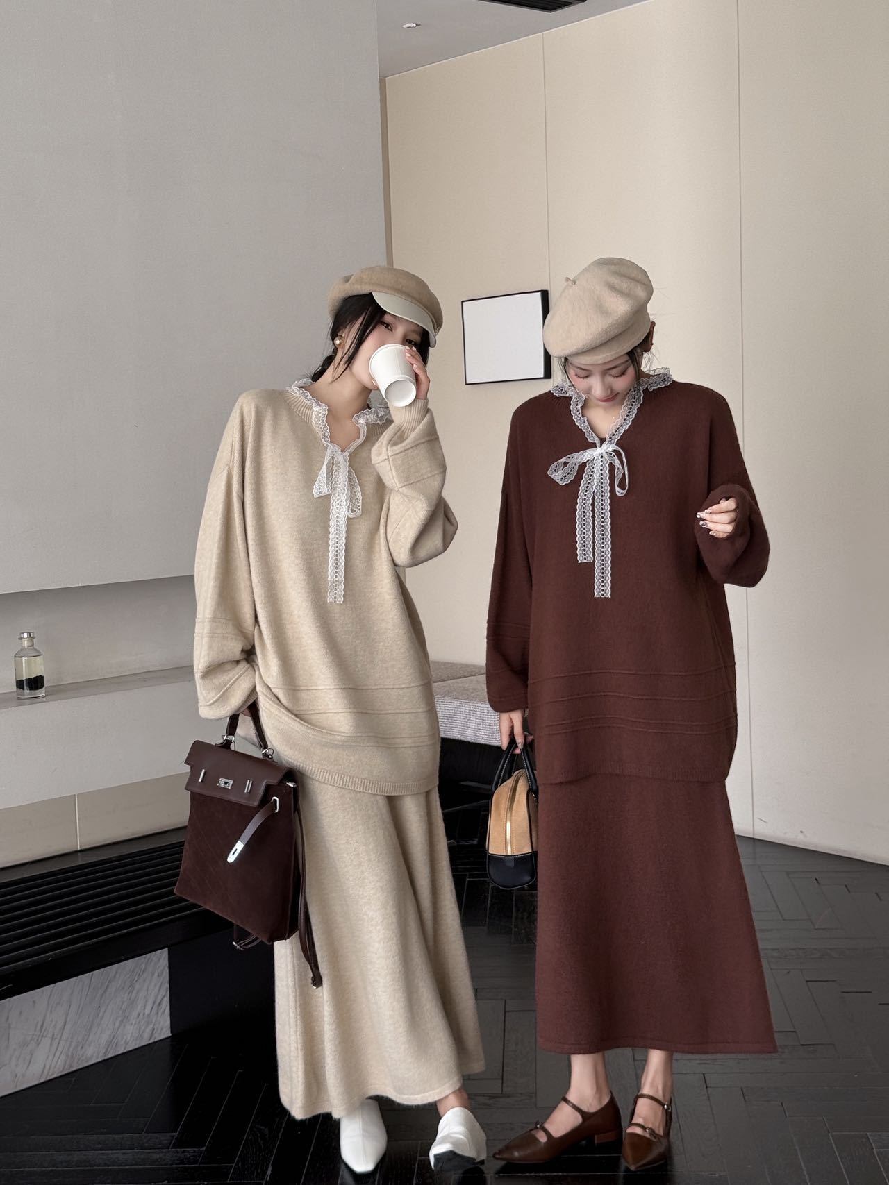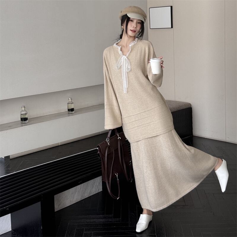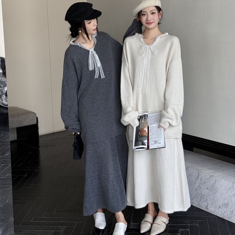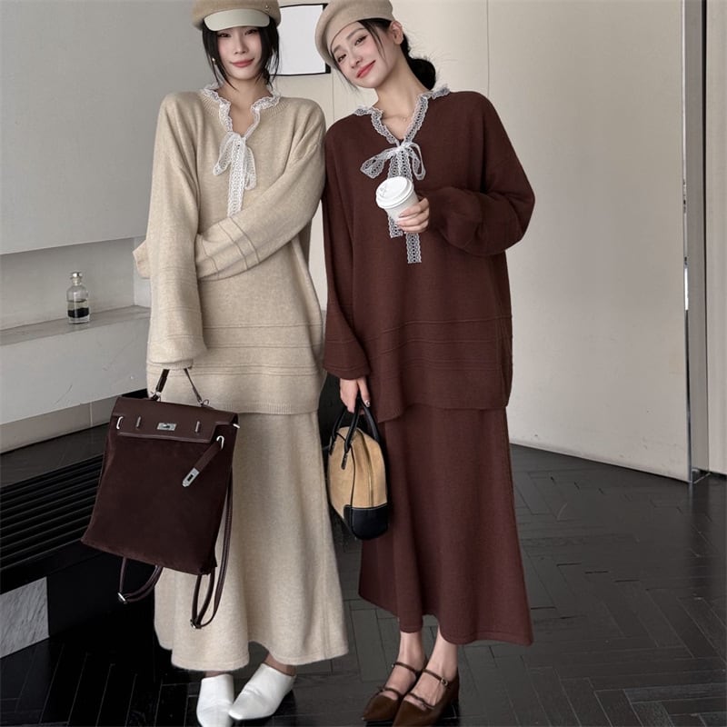 【set】レースVネックニットトップス×ロングスカートセット Q6769