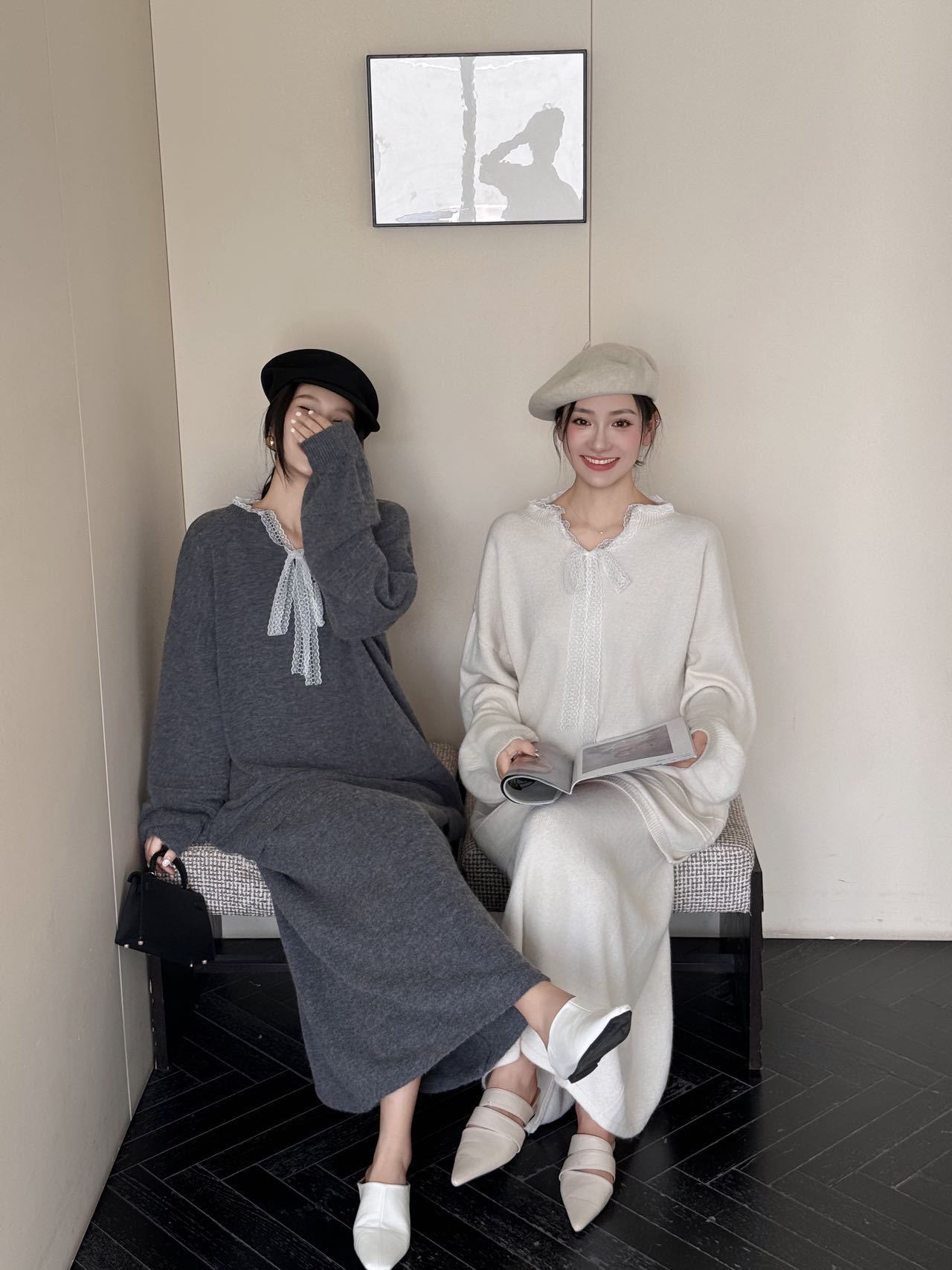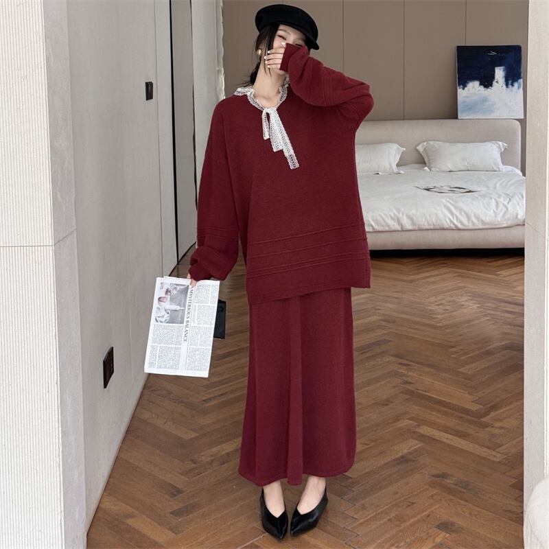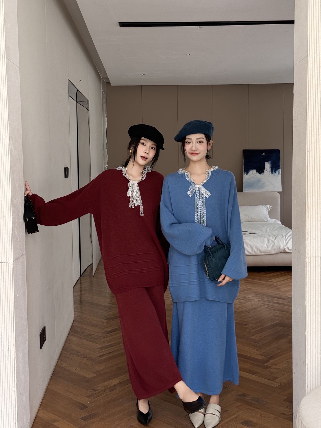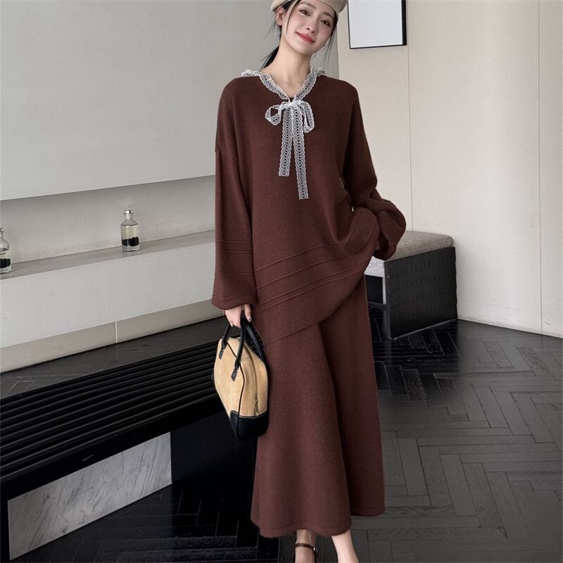 【set】レースVネックニットトップス×ロングスカートセット Q6769
