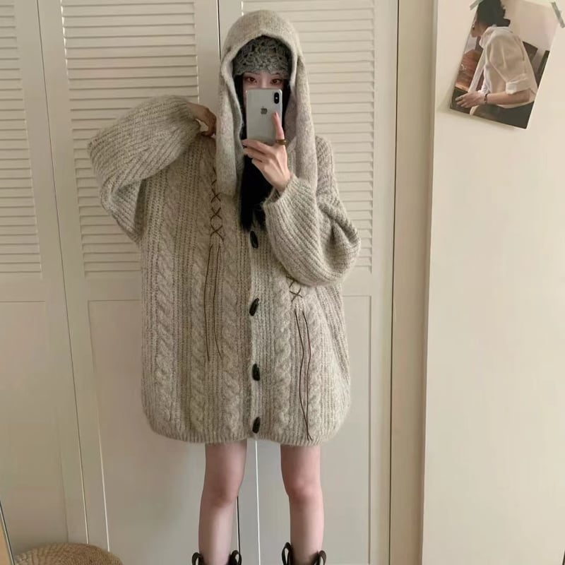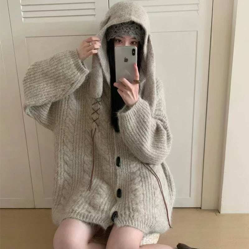 【outer】ウサギ耳付きニットカーディガン Q6778
