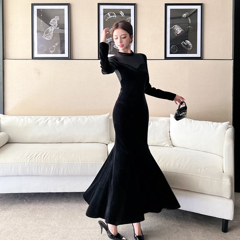 【dress】チュールドッキングベルベットマーメイドワンピース Q6827