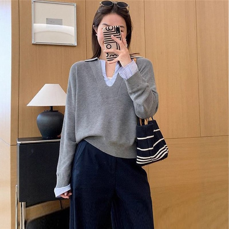 【tops】ストライプ柄ドッキングVネックニットトップス Q6857