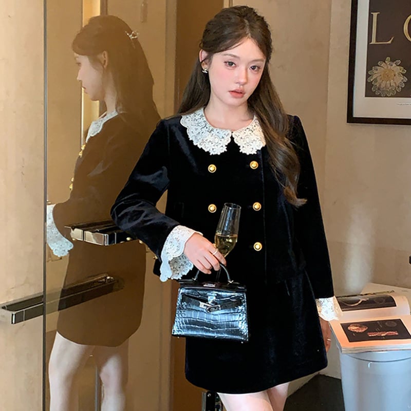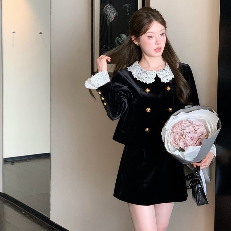 【set】レース付きベルベットトップス×ミニスカートセット Q6875