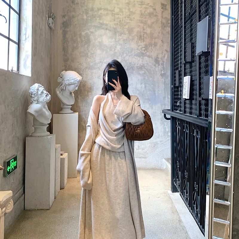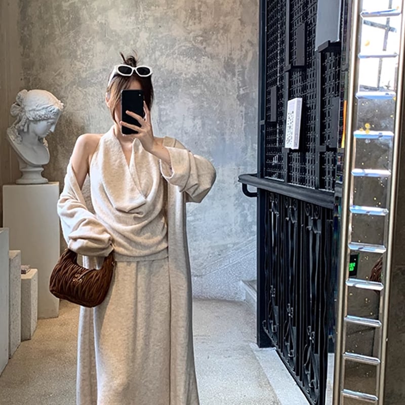 【set】ホルターネックキャミ×カーディガン×ロングスカート3点セット Q6892