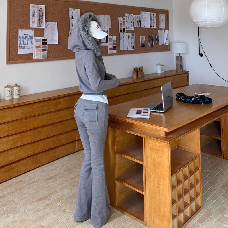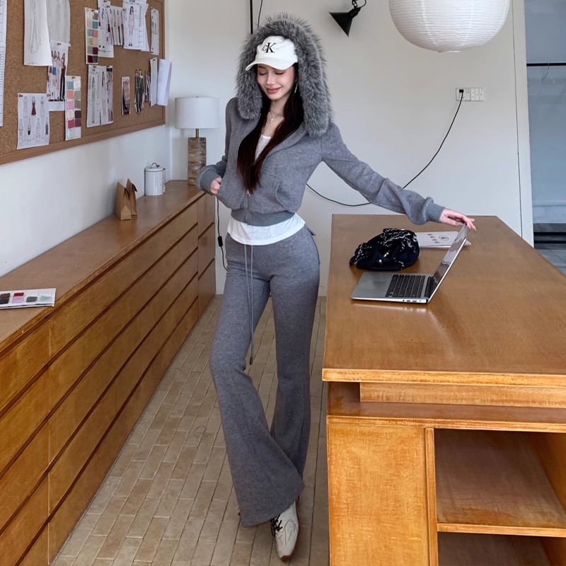【set】ファー付きコート×ラッパズボンセット Q6894