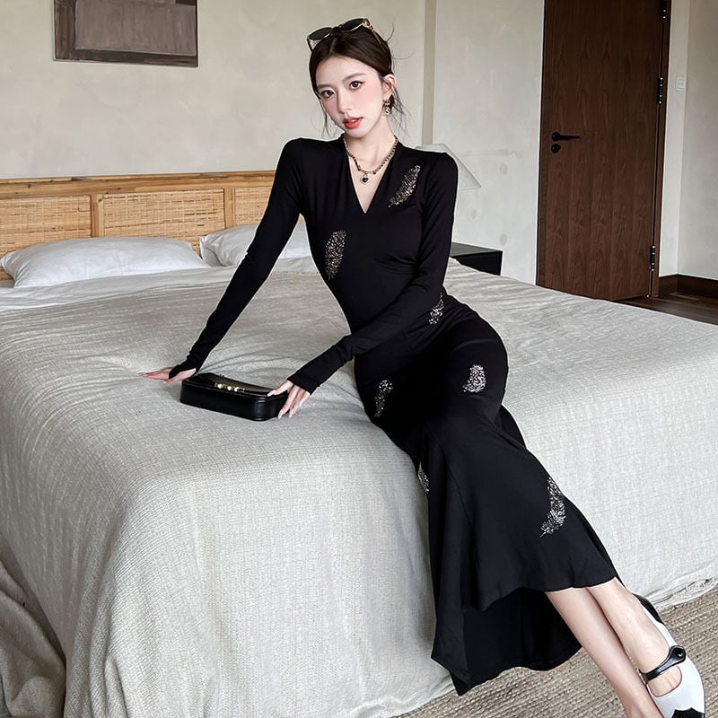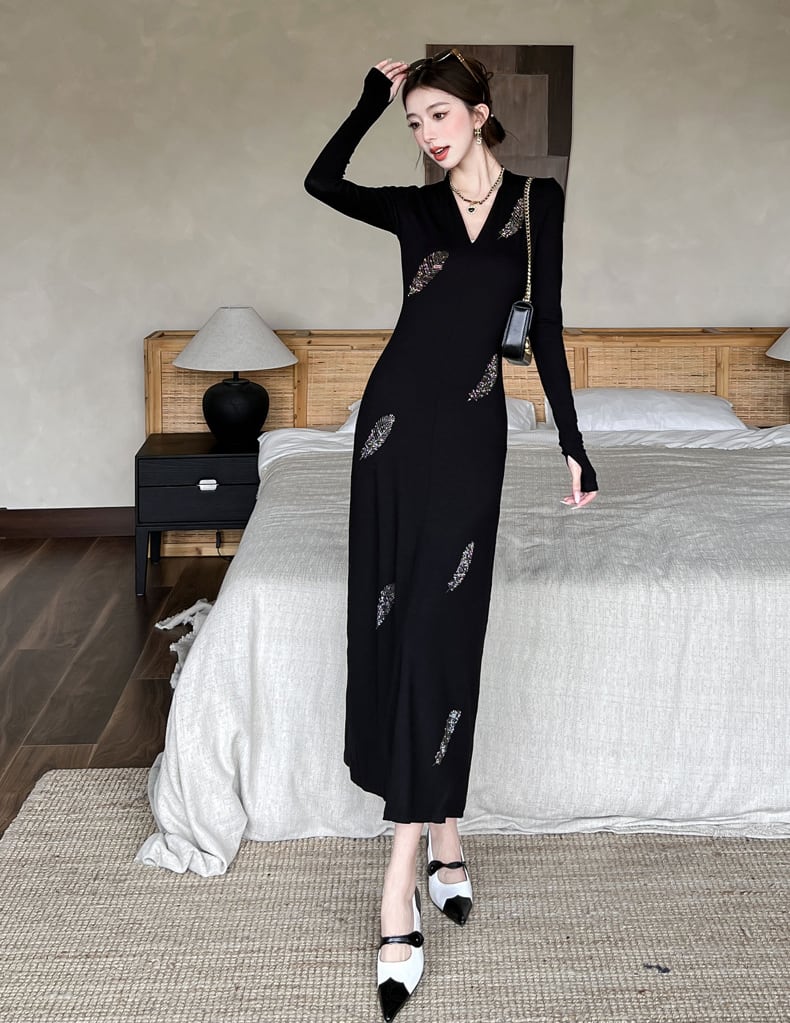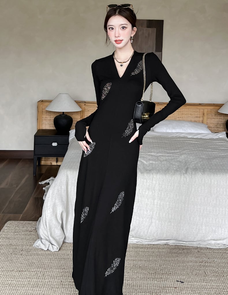 【dress】Vネック刺繡柄ロングワンピース Q6902