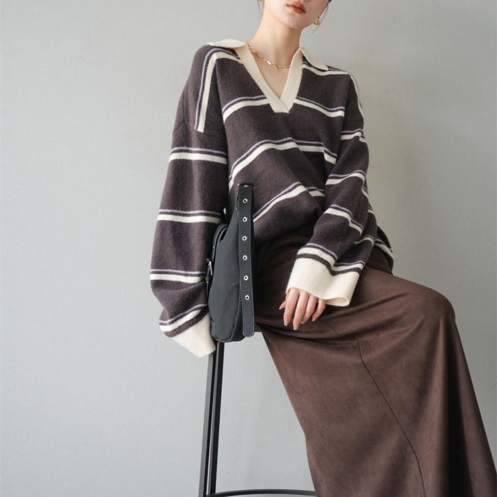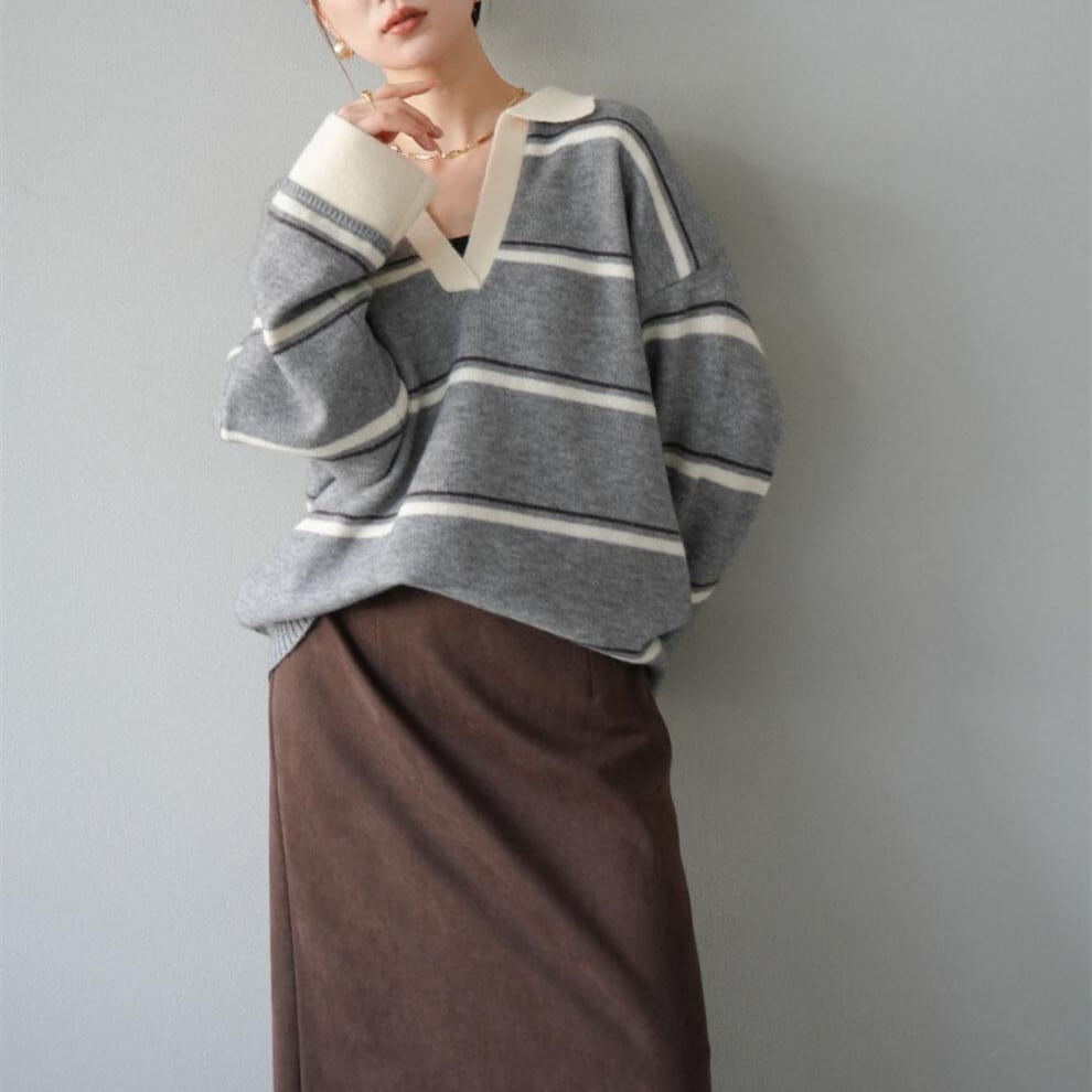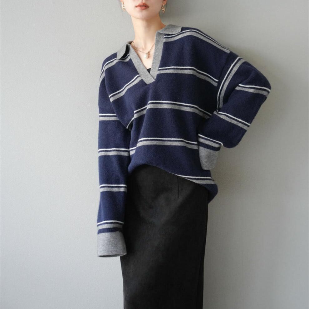 【tops】Ⅴネックボーダー柄ニットトップス N3430
