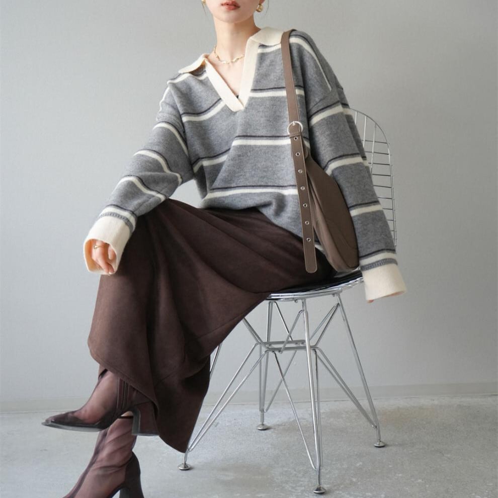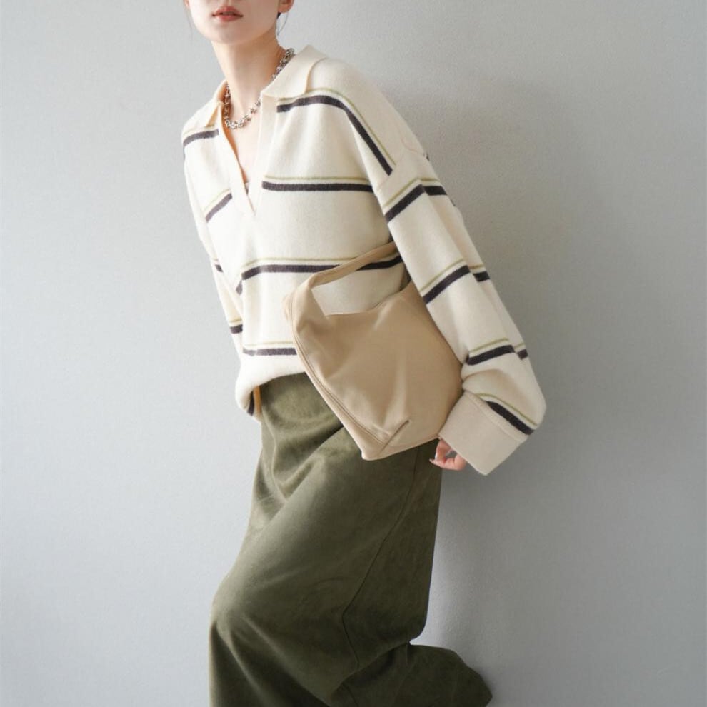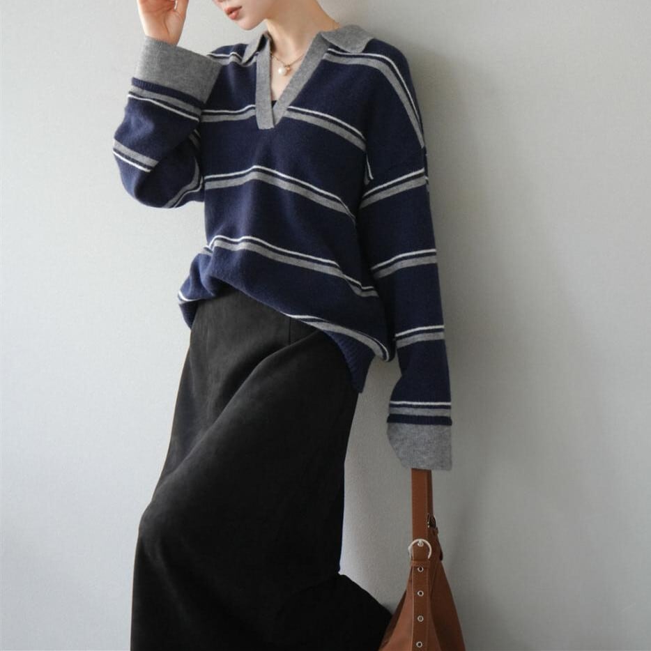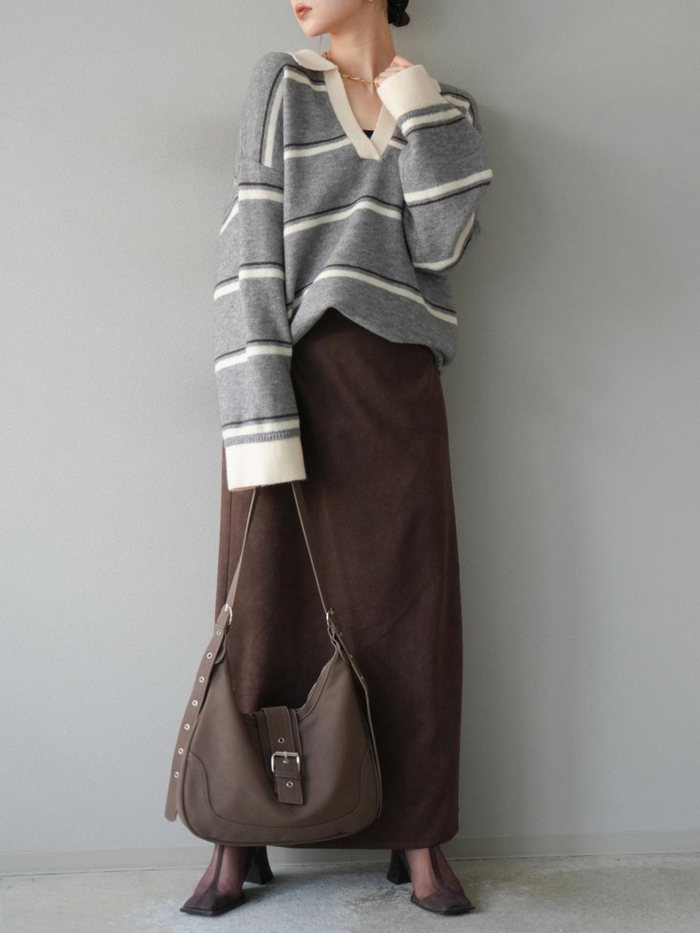 【tops】Ⅴネックボーダー柄ニットトップス N3430