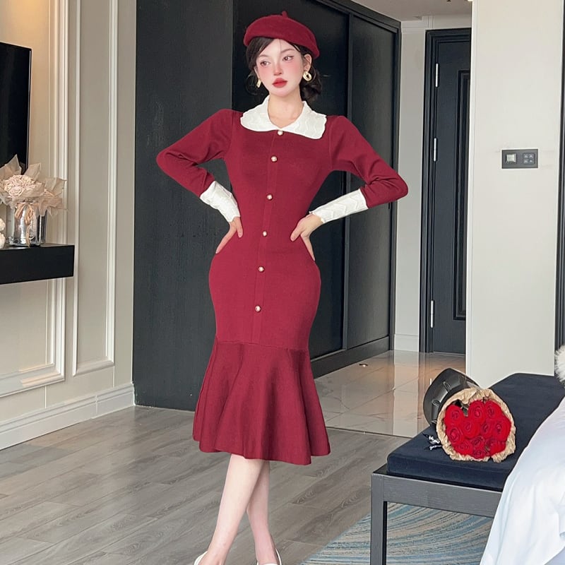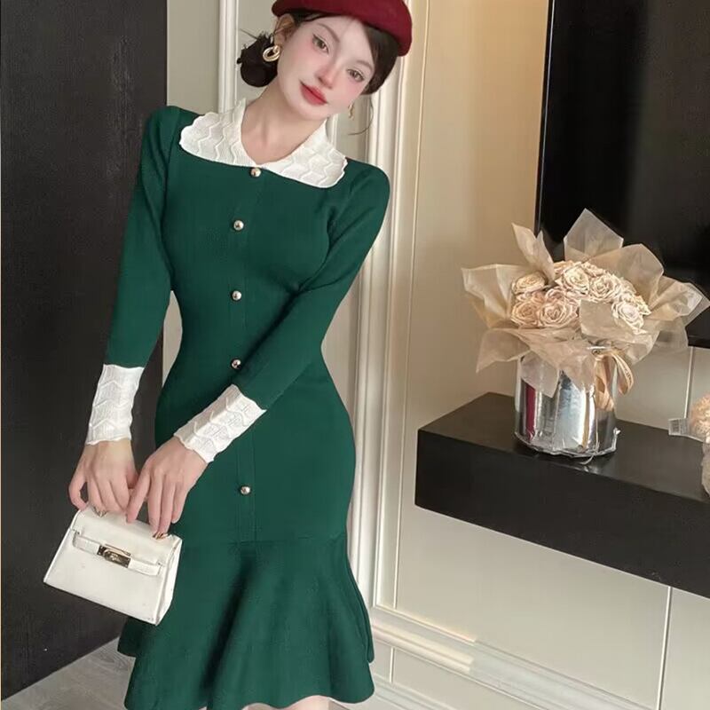【dress】ピーターパンカラーフレアニットワンピース Q6934