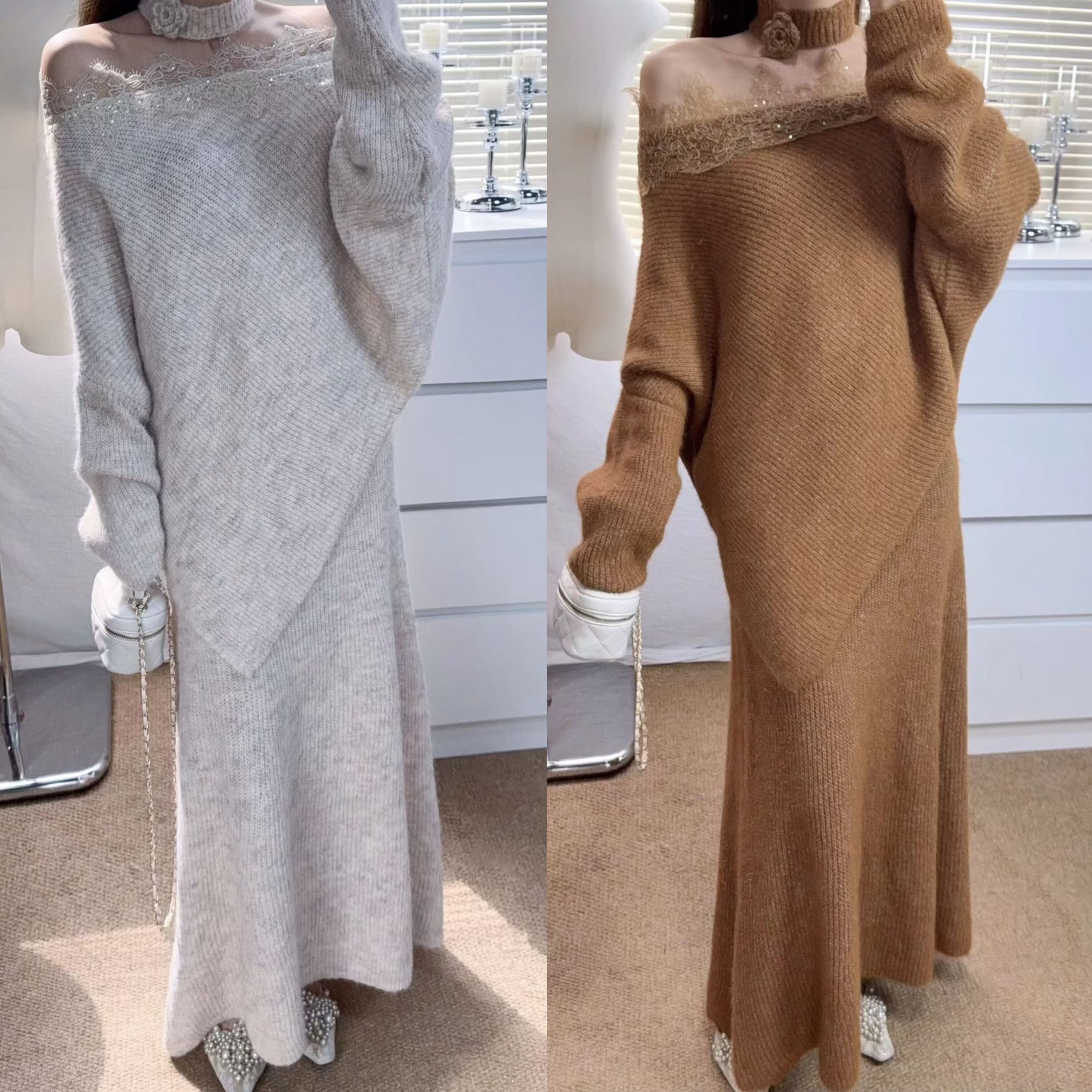 【set】レースドッキングニットトップス×ロングスカートセット Q6952