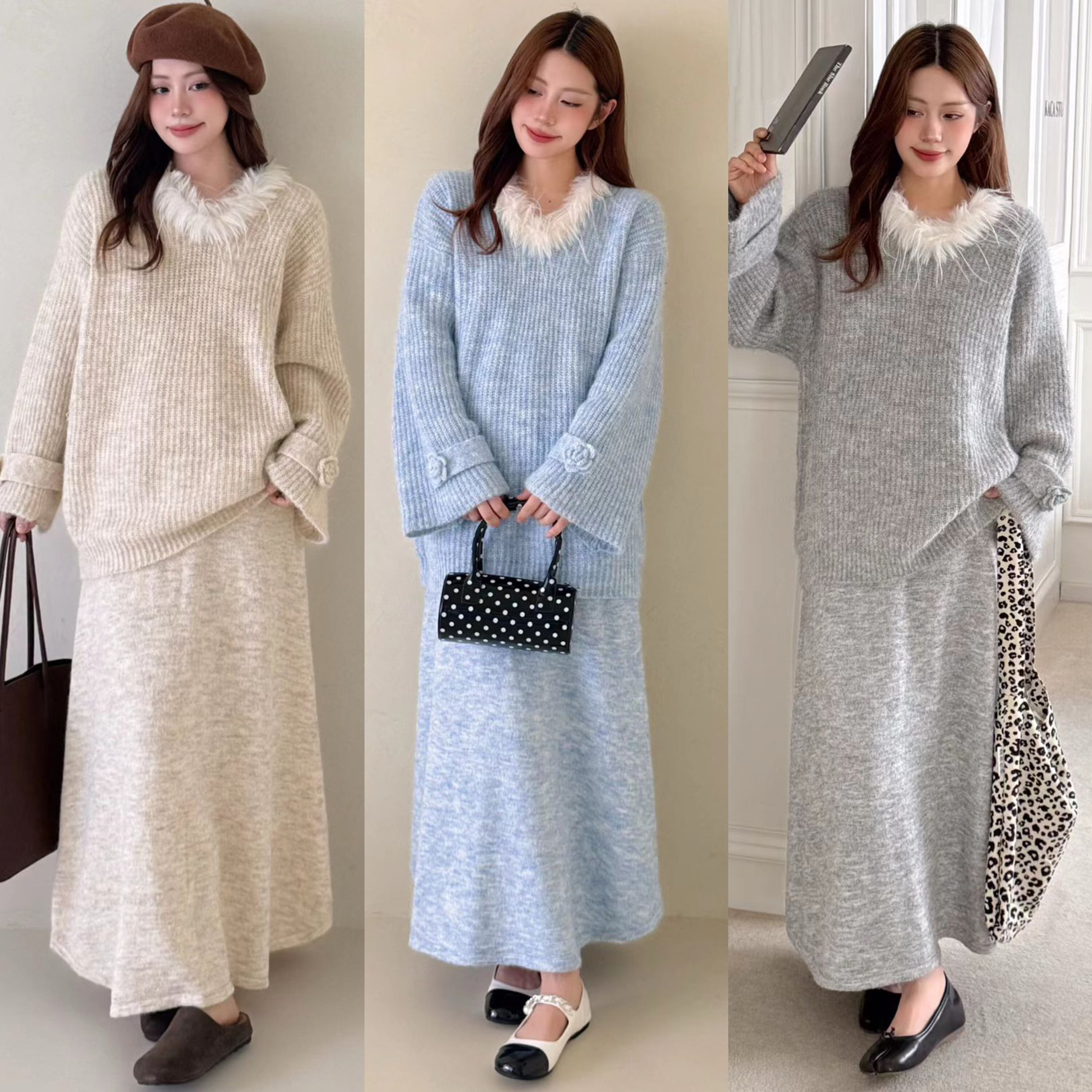 【set】ファーネックニットトップス×ロングスカートセット Q6956