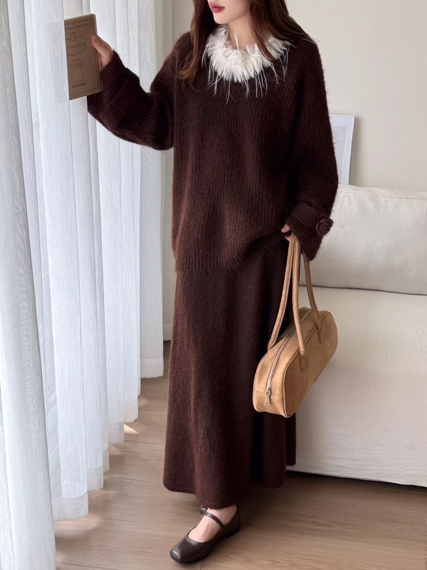 【set】ファー付きニットトップス×ロングスカートセット Q6956