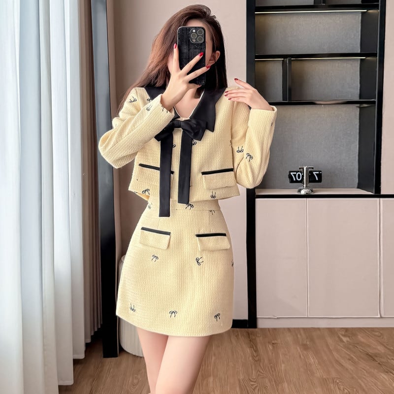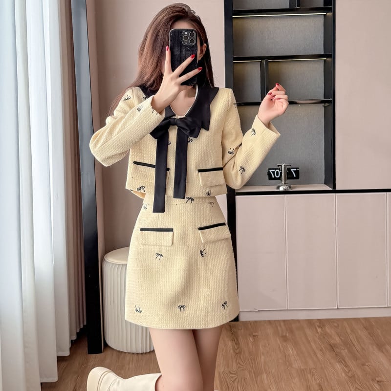 【set】リボン付きコート×ミニスカートセット Q7006