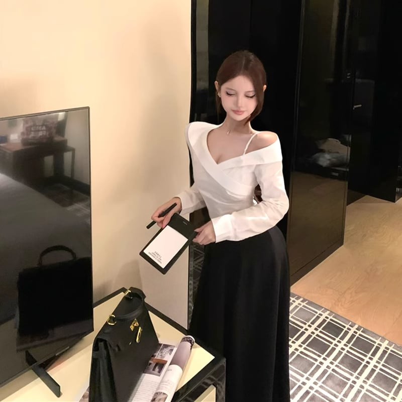 【set】ワンショルダートップス×フレアスカートセット Q7016