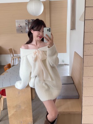 【set】リボンオフショルニットトップス×ミニスカートセット Q7018