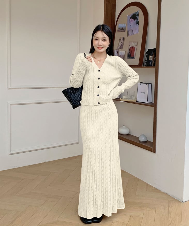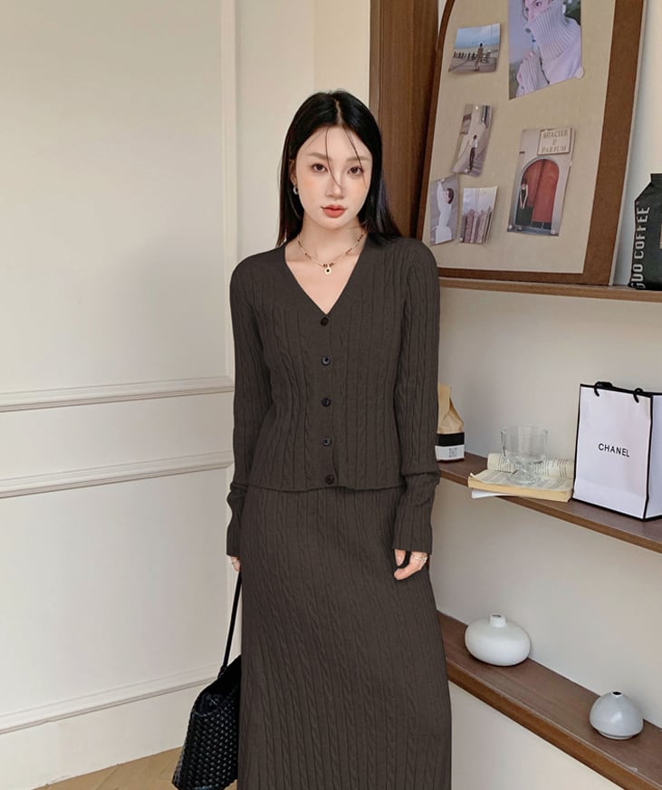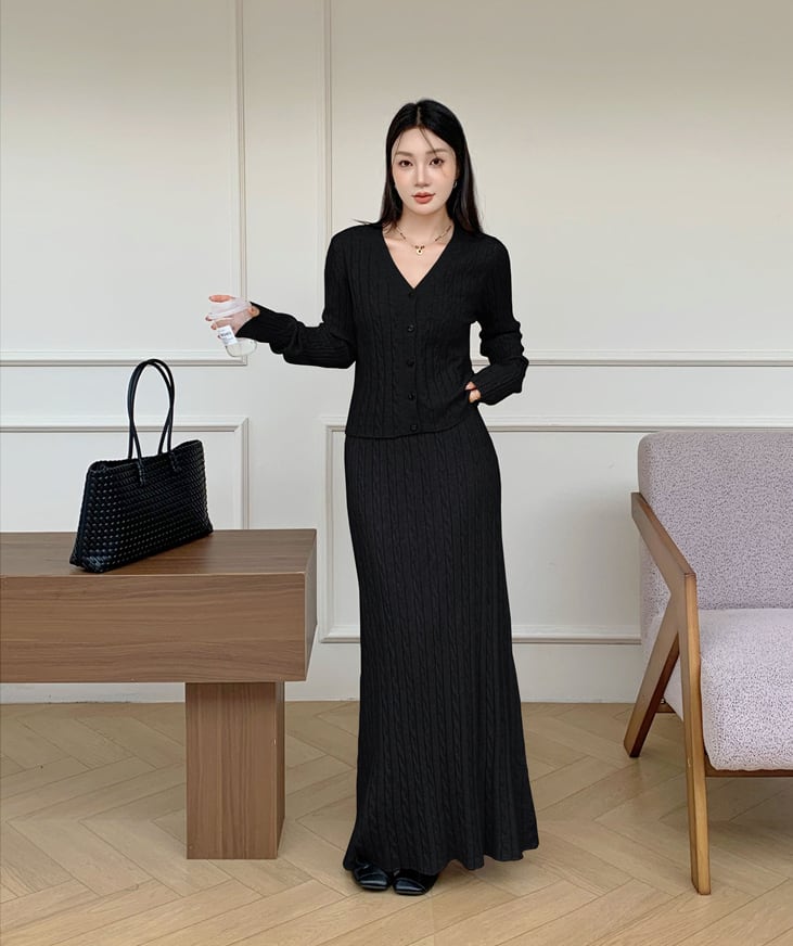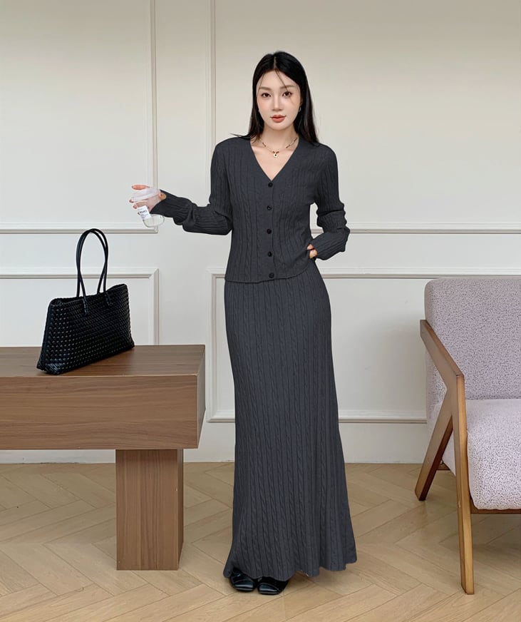 【set】Vネックカーディガン×ロングスカートセット Q7037