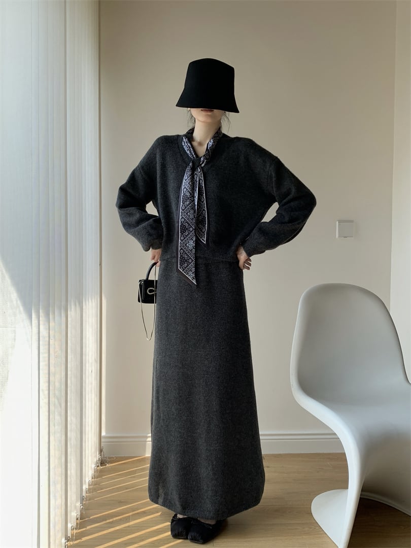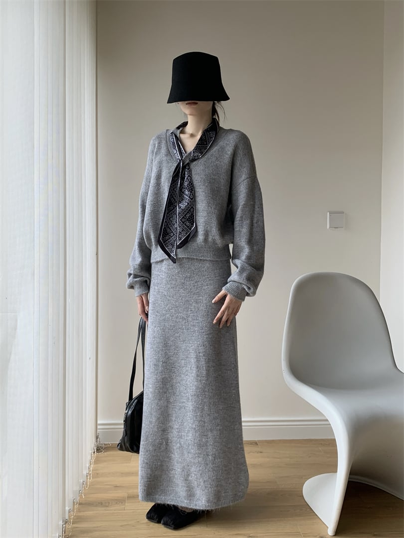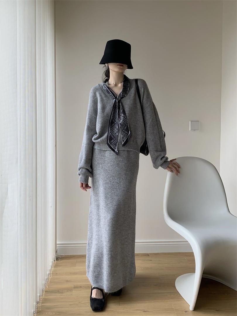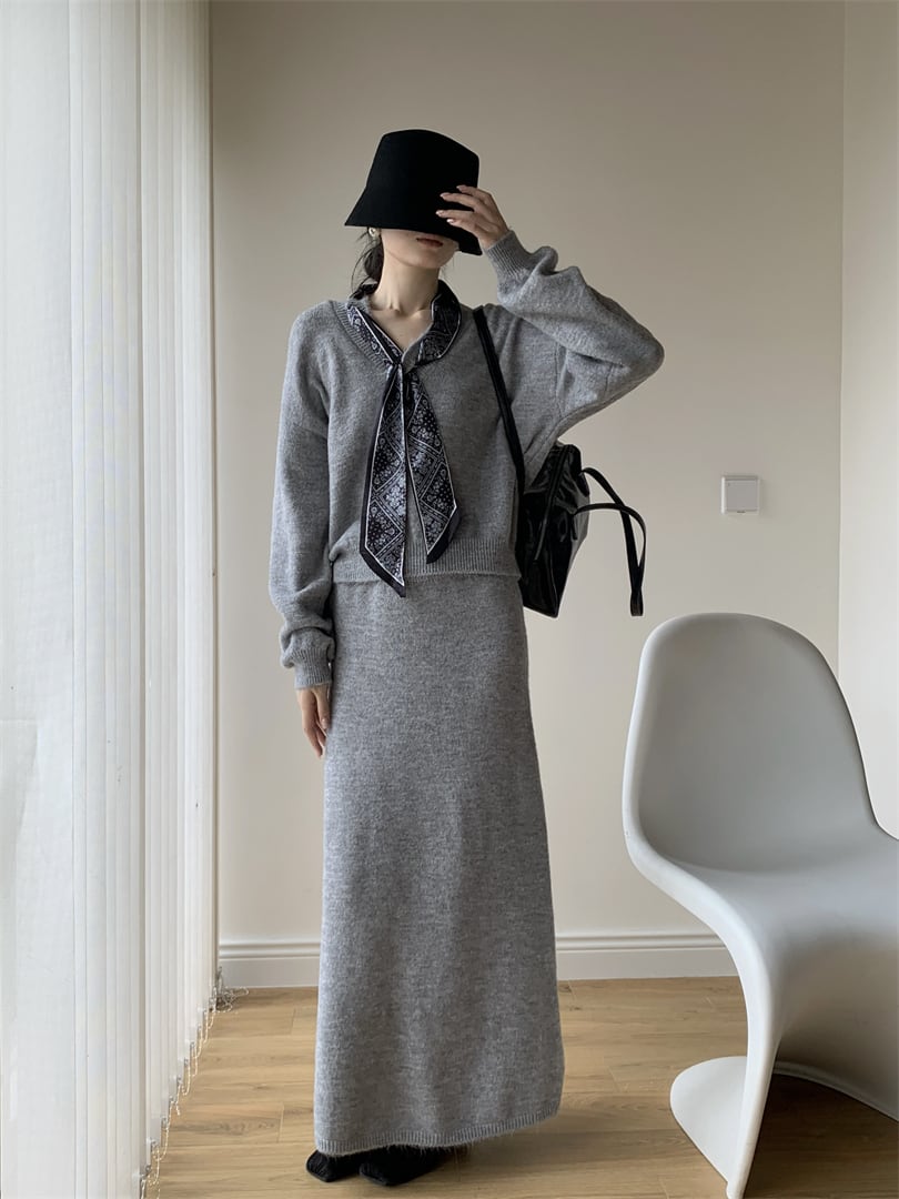 【set】スカーフ付きニットトップス×ロングスカートセット N3452