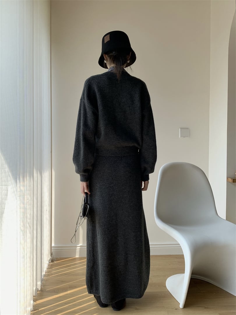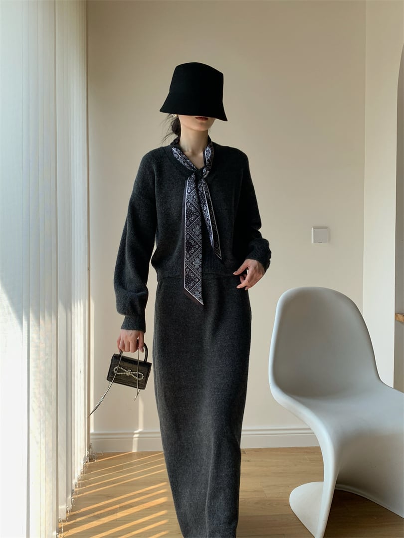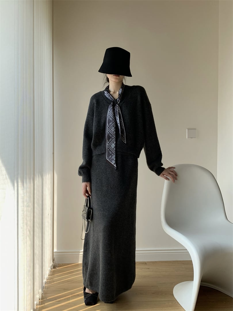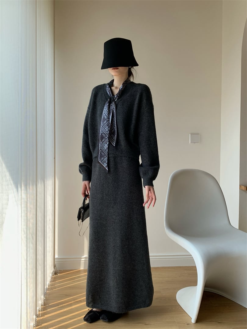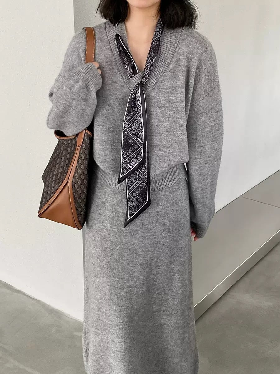 【set】スカーフ付きニットトップス×ロングスカートセット N3452