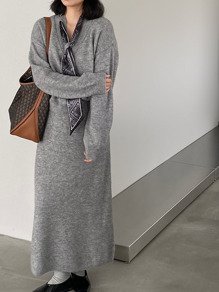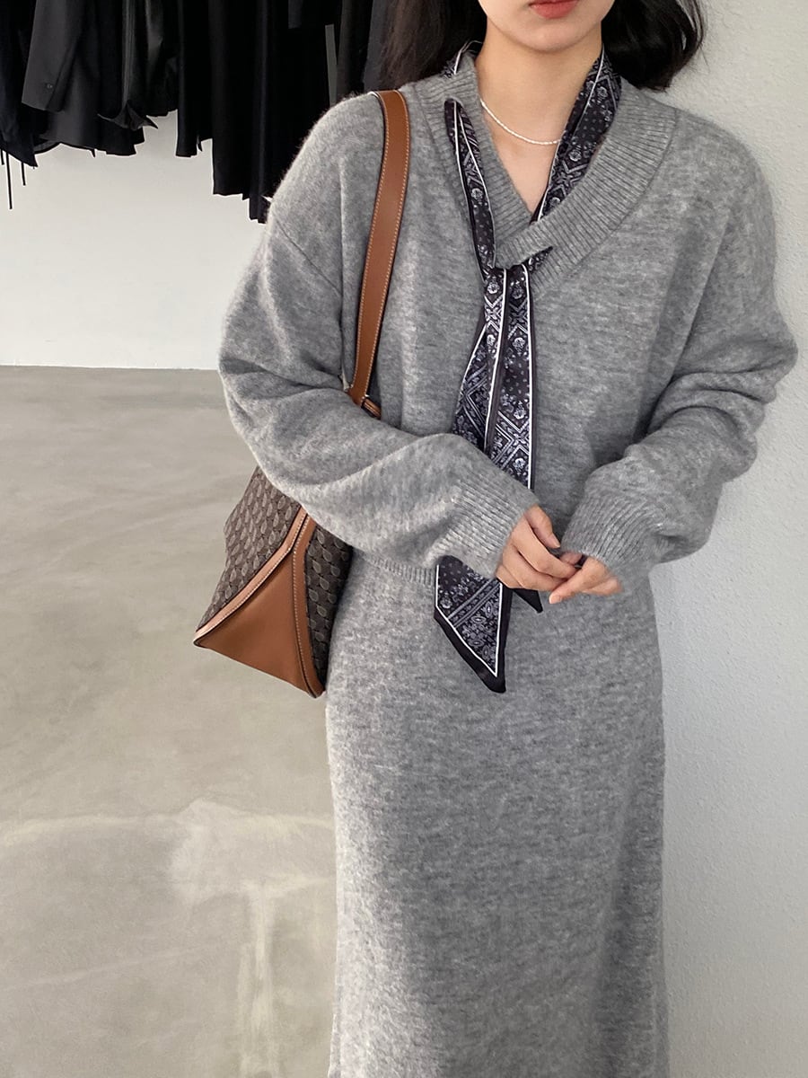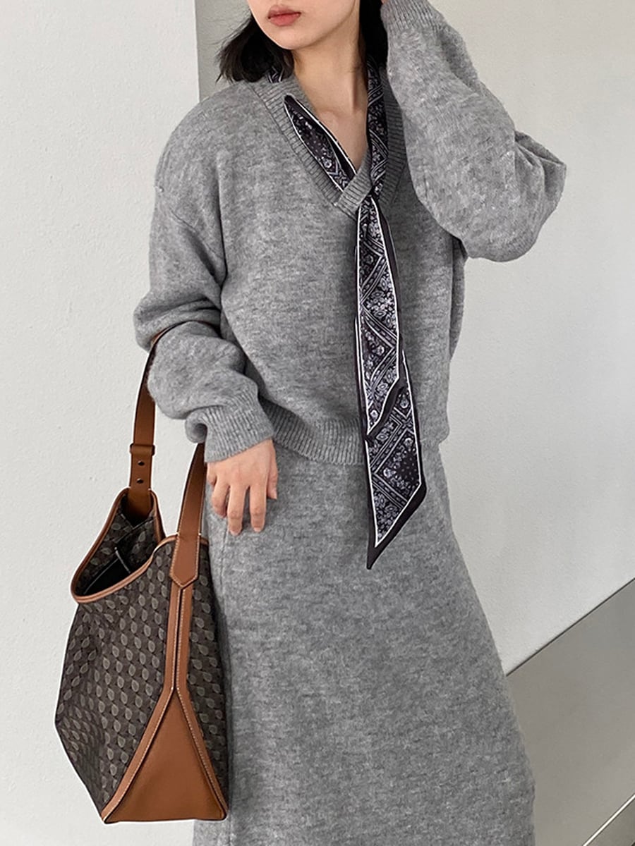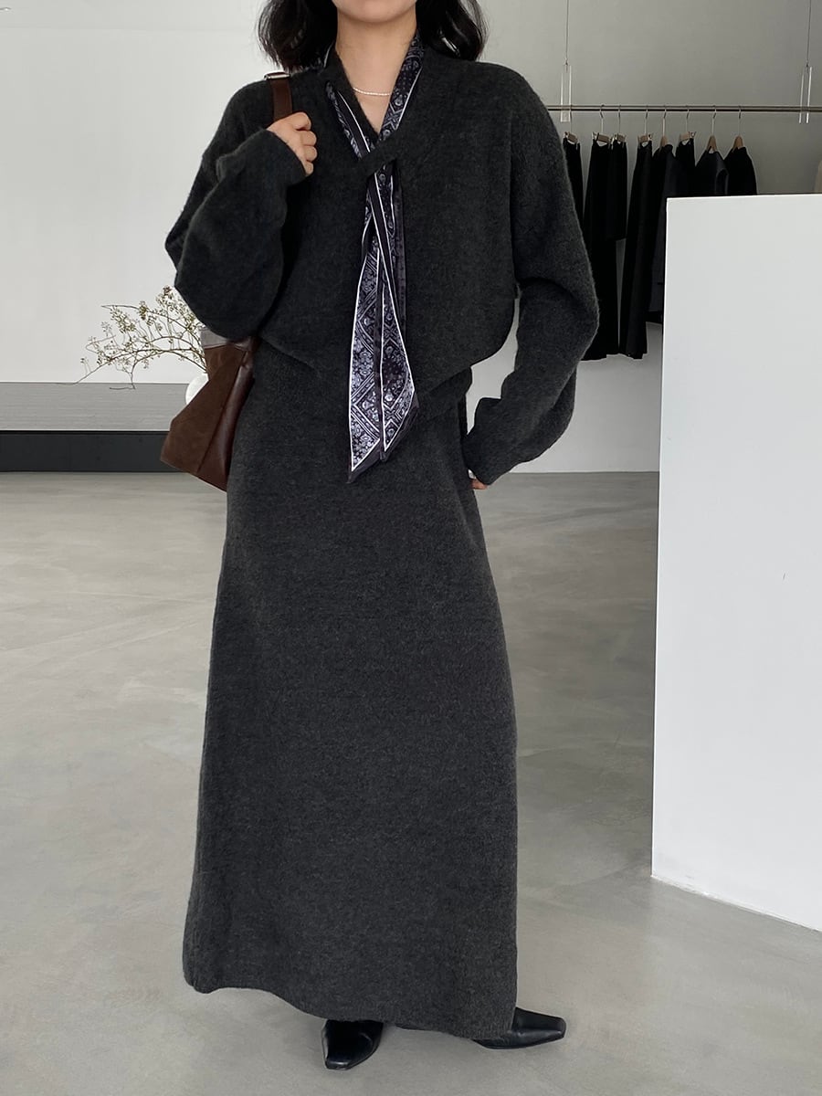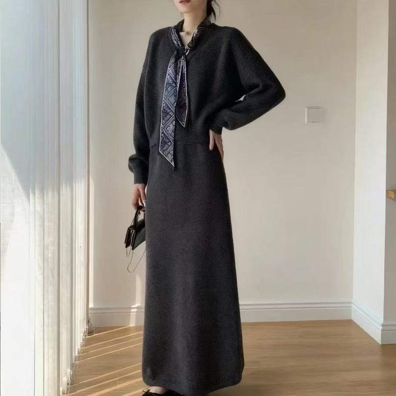 【set】スカーフ付きニットトップス×ロングスカートセット Q7055