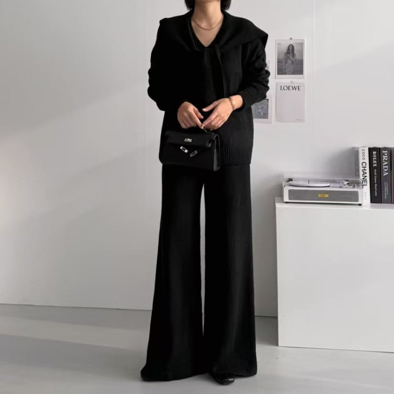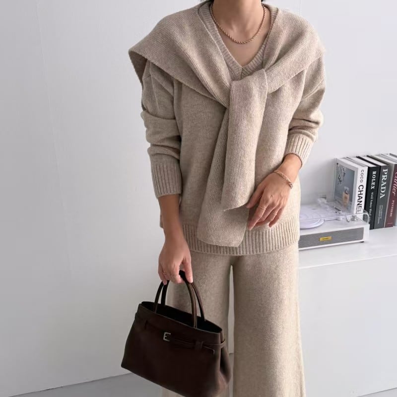 【set】スカーフ×ニットトップス×ワイドパンツ3点セット Q7063