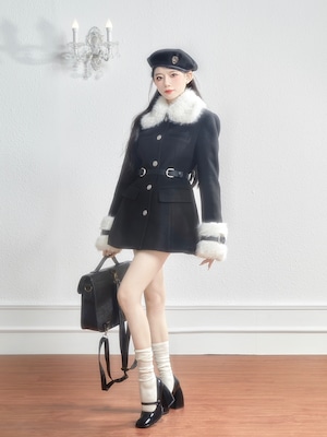 襟と袖口のファーが華やかに顔まわりを包み込み、季節感たっぷりのムードに。