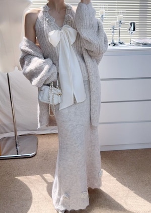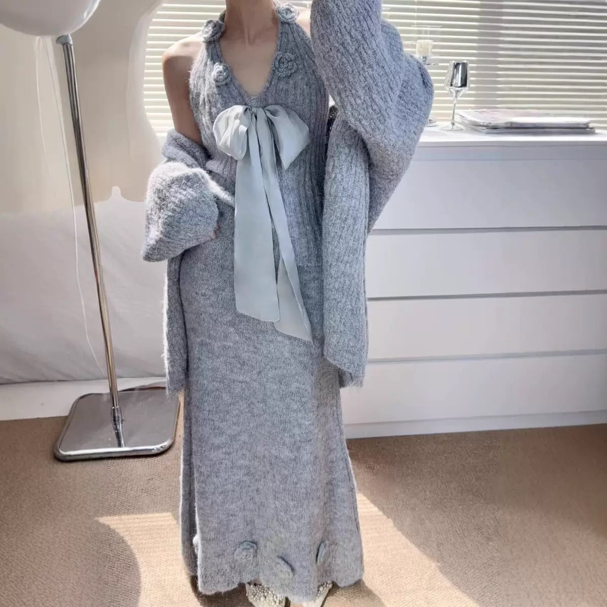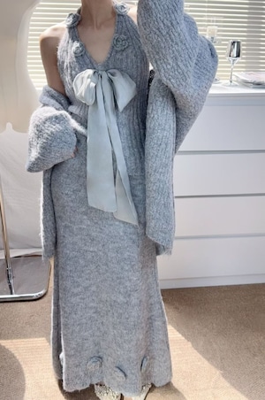 【set】リボンホルターネックニットトップス×カーディガン×スカート3点セット N3458
