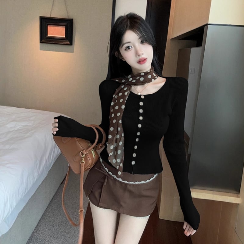 【outer】ドット柄スカーフ付きニットカーディガン Q7108